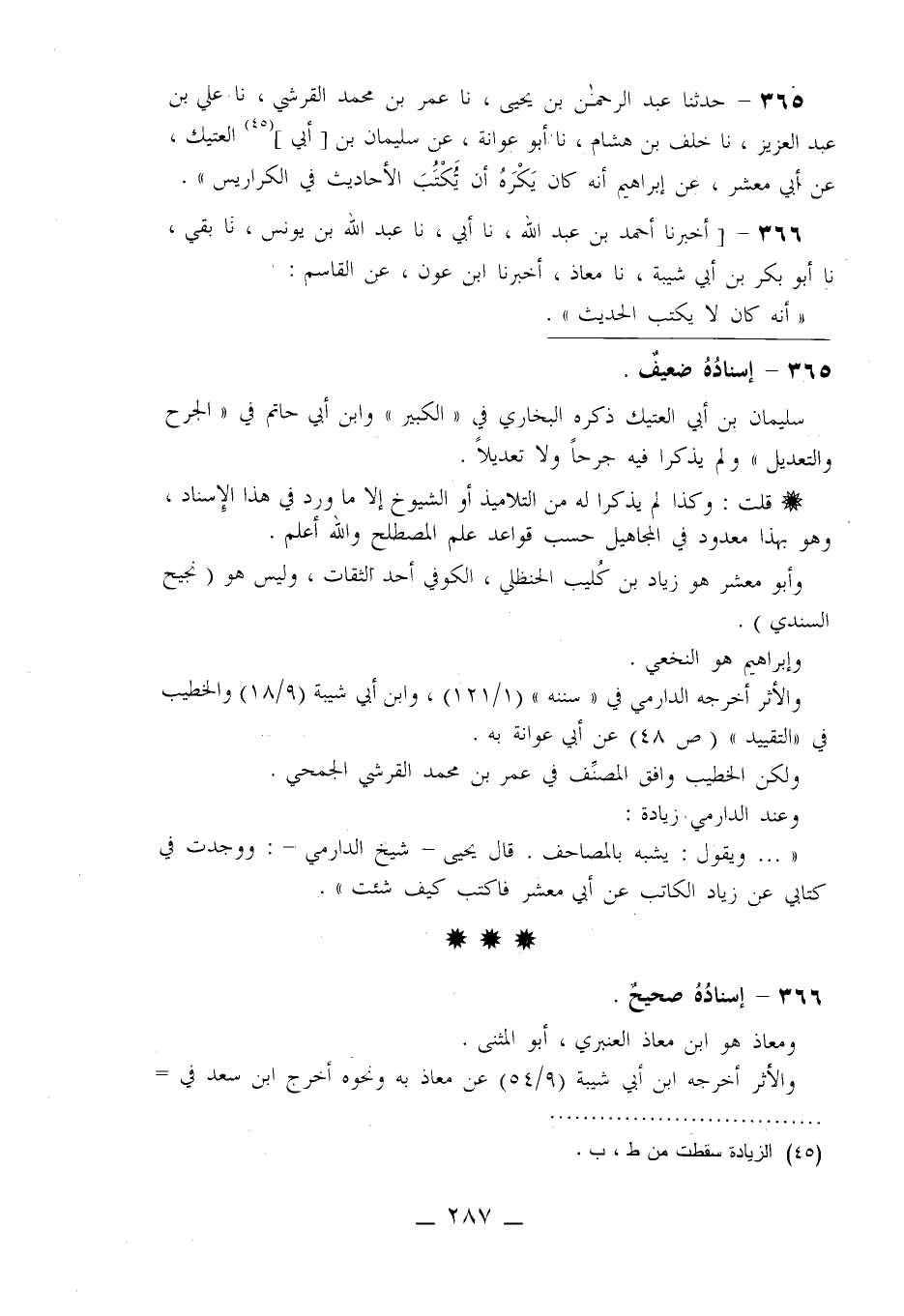 365 - حَدَّثَنَا عَبْدُ الرَّحْمَنِ بْنُ يَحْيَى، نا عُمَرُ بْنُ مُحَمَّدٍ الْقُرَشِيُّ، نا عَلِيُّ بْنُ عَبْدِ الْعَزِيزِ، نا خَلَفُ بْنُ هِشَامٍ، نا أَبُو عَوَانَةَ، عَنْ سُلَيْمَانَ بْنِ أَبِي الْعَتِيكِ، عَنْ أَبِي مَعْشَرٍ، عَنْ إِبْرَاهِيمَ: «أَنَّهُ كَانَ §يَكْرَهُ أَنْ يَكْتُبَ الْأَحَادِيثَ فِي الْكَرَارِيسِ»
