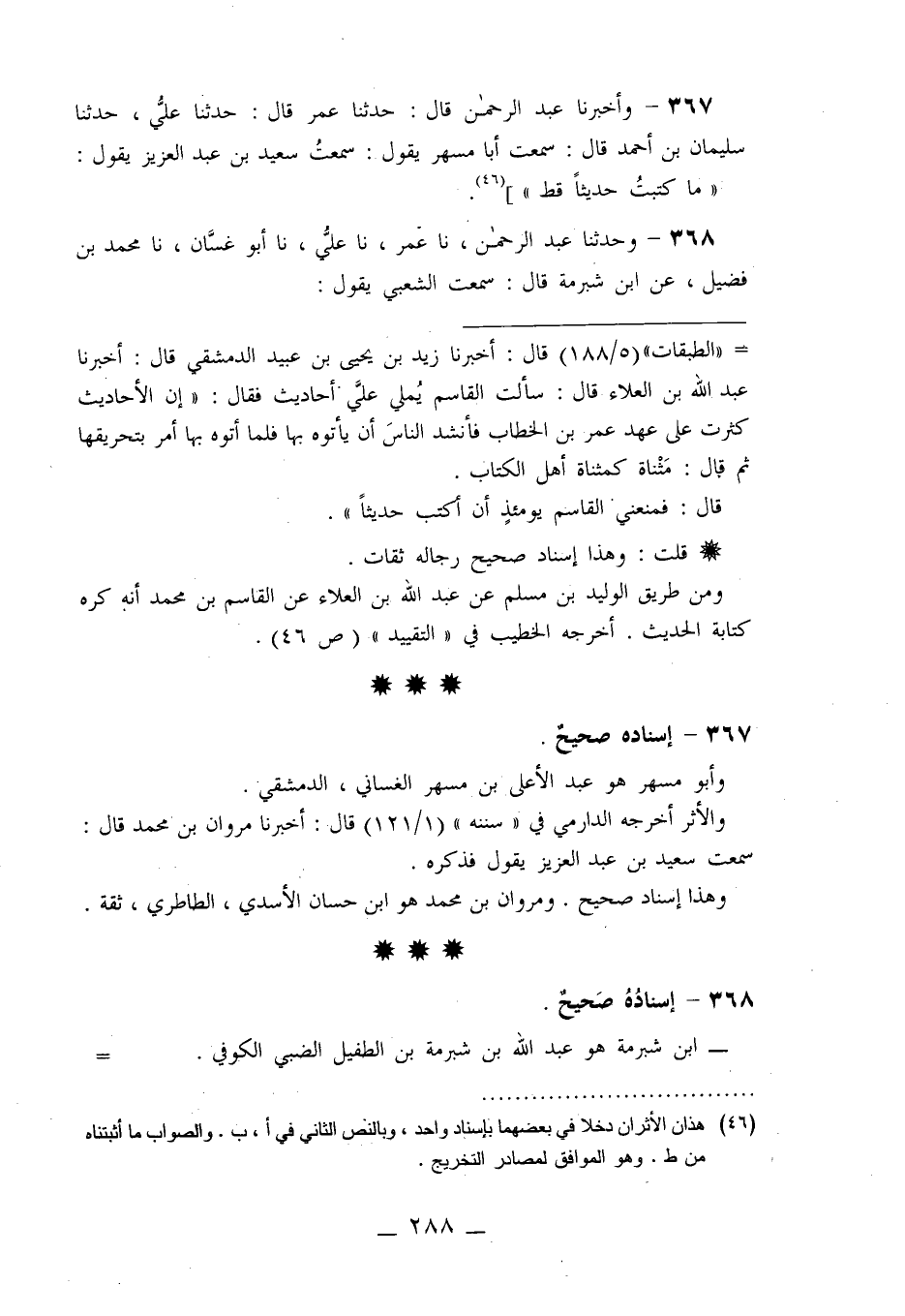 367 - وَأَخْبَرَنَا عَبْدُ الرَّحْمَنِ قَالَ: حَدَّثَنَا عُمَرُ قَالَ: حَدَّثَنَا عَلِيٌّ، حَدَّثَنَا سُلَيْمَانُ بْنُ أَحْمَدَ قَالَ: سَمِعْتُ أَبَا مُسْهِرٍ يَقُولُ: سَمِعْتُ سَعِيدَ بْنَ عَبْدِ الْعَزِيزِ يَقُولُ: «مَا §مَا كَتَبْتُ حَدِيثًا قَطُّ»