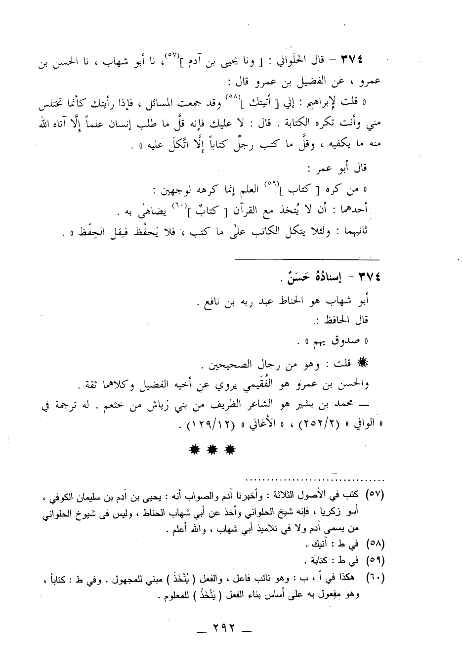 374 - قَالَ الْحُلْوَانِيُّ، وَنا يَحْيَى بْنُ آدَمَ، نا أَبُو شِهَابٍ، نا الْحَسَنُ بْنُ عَمْرٍو، عَنِ الْفُضَيْلِ بْنِ عَمْرٍو قَالَ: " قُلْتُ لِإِبْرَاهِيمَ: إِنِّي أَتَيْتُكَ وَقَدْ جَمَعْتُ الْمَسَائِلَ فَإِذَا رَأَيْتُكَ كَأَنَّمَا تَخْتَلِسُ مِنِّي وَأَنْتَ تَكْرَهُ الْكِتَابَةَ قَالَ: «لَا عَلَيْكَ؛ فَإِنَّهُ §قَلَّ مَا طَلَبَ إِنْسَانٌ عِلْمًا إِلَّا آتَاهُ اللَّهُ مِنْهُ مَا يَكْفِيهِ، وَقَلَّ مَا كَتَبَ رَجُلٌ كِتَابًا إِلَّا اتَّكَلَ عَلَيْهِ» قَالَ أَبُو عُمَرَ: مَنْ كَرِهَ كِتَابَ الْعِلْمِ، إِنَّمَا كَرِهَهُ لِوَجْهَيْنِ، أَحَدُهُمَا: أَلَّا يُتَّخَذَ مَعَ الْقُرْآنِ كِتَابٌ يُضَاهَى بِهِ ثَانِيهِمَا: وَلِئَلَّا يَتَّكِلَ الْكَاتِبُ عَلَى مَا كَتَبَ فَلَا يَحْفَظَ فَيَقِلَّ الْحِفْظُ -[293]-