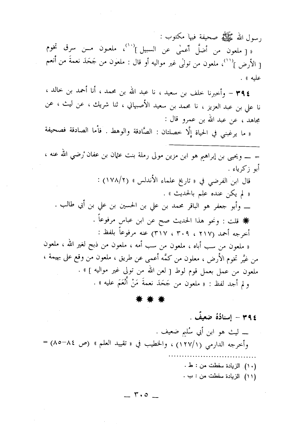 394 - وَأَخْبَرَنَا خَلَفُ بْنُ سَعِيدٍ، نا عَبْدُ اللَّهِ بْنُ مُحَمَّدٍ، أنا أَحْمَدُ بْنُ خَالِدٍ، نا عَلِيُّ بْنُ عَبْدِ الْعَزِيزِ نا مُحَمَّدُ بْنُ سَعِيدٍ الْأَصْبَهَانِيُّ، ثنا شَرِيكٌ، عَنْ لَيْثٍ، عَنْ مُجَاهِدٍ، عَنْ عَبْدِ اللَّهِ بْنِ عَمْرٍو قَالَ: «§مَا يُرَغِّبُنِي فِي الْحَيَاةِ إِلَّا خَصْلَتَانِ الصَّادِقَةُ وَالْوَهْطُ، فَأَمَّا الصَّادِقَةُ فَصَحِيفَةٌ -[306]- كَتَبْتُهَا عَنْ رَسُولِ اللَّهِ صَلَّى اللَّهُ عَلَيْهِ وَسَلَّمَ، وَأَمَّا الْوَهْطُ فَأَرْضٌ تَصَدَّقَ بِهَا عَمْرُو بْنُ الْعَاصِ كَانَ يَقُومُ عَلَيْهَا»