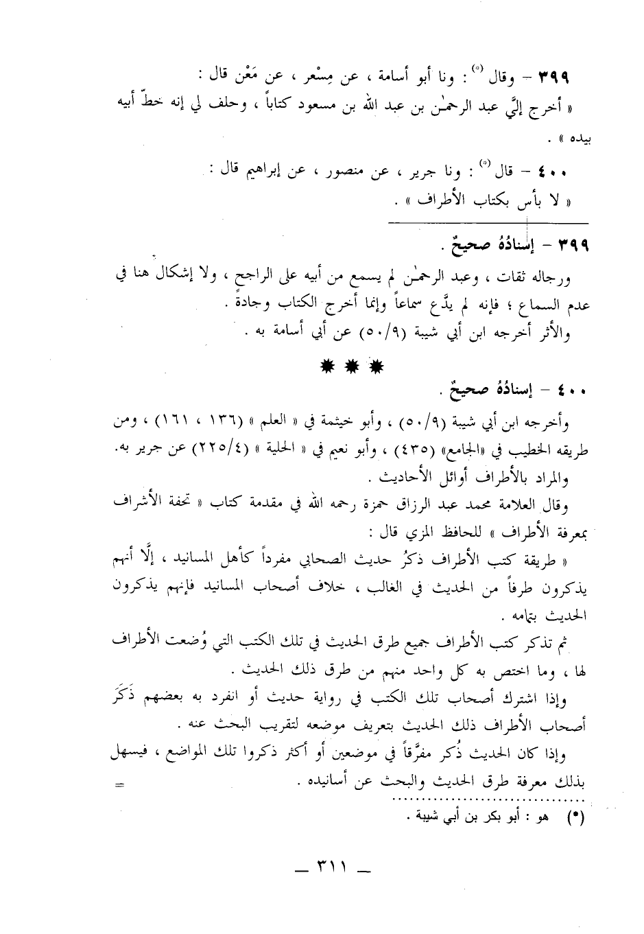 400 - قَالَ: وَنا جَرِيرٌ، عَنْ مَنْصُورٍ، عَنْ إِبْرَاهِيمَ قَالَ: §«لَا بَأْسَ بِكِتَابِ الْأَطْرَافِ»