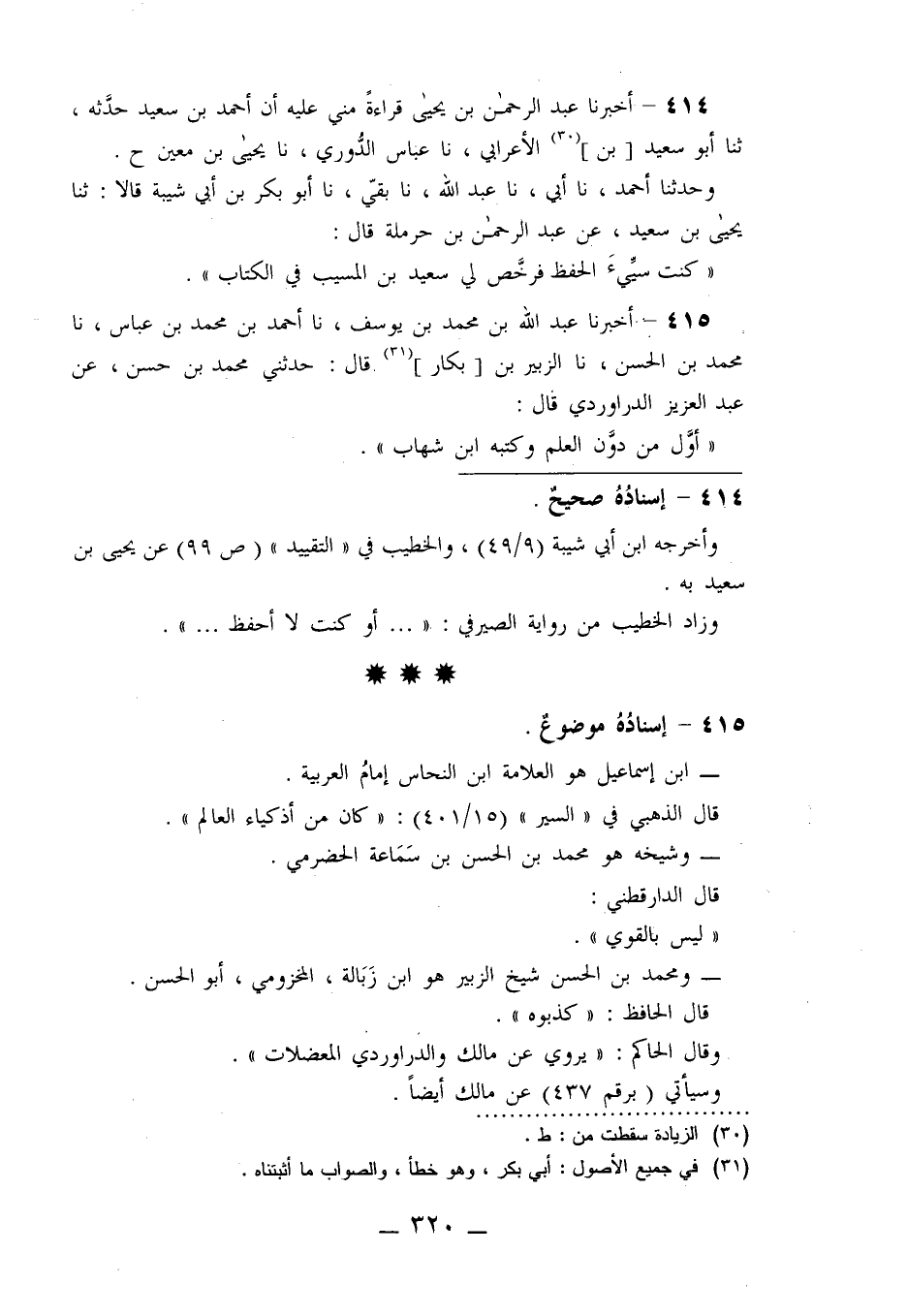 414 - أَخْبَرَنَا عَبْدُ الرَّحْمَنِ بْنُ يَحْيَى قِرَاءَةً مِنِّي عَلَيْهِ، أَنَّ أَحْمَدَ بْنَ سَعِيدٍ حَدَّثَهُ، ثنا أَبُو سَعِيدِ بْنُ الْأَعْرَابِيِّ، نا عَبَّاسٌ الدُّورِيُّ، نا يَحْيَى بْنُ مَعِينٍ ح وَحَدَّثَنَا أَحْمَدُ، نا أَبِي، نا عَبْدُ اللَّهِ، نا بَقِيٌّ، نا أَبُو بَكْرِ بْنُ أَبِي شَيْبَةَ قَالَا: ثنا يَحْيَى بْنُ سَعِيدٍ، عَنْ عَبْدِ الرَّحْمَنِ بْنِ حَرْمَلَةَ قَالَ: §«كُنْتُ سَيِّئَ الْحِفْظِ فَرَخَّصَ لِي سَعِيدُ بْنُ الْمُسَيِّبِ فِي الْكِتَابِ»