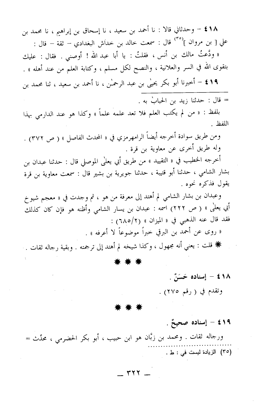 418 - وَحَدَّثَانِي قَالَا: نا أَحْمَدُ بْنُ سَعِيدٍ، نا إِسْحَاقُ بْنُ إِبْرَاهِيمَ، نا مُحَمَّدُ بْنُ عَلِيِّ بْنِ مَرْوَانَ قَالَ: سَمِعْتُ خَالِدَ بْنَ خِدَاشٍ الْبَغْدَادِيَّ ثِقَةٌ قَالَ: وَدَّعْتُ مَالِكَ بْنَ أَنَسٍ، فَقُلْتُ: يَا أَبَا عَبْدِ اللَّهِ أَوْصِنِي، فَقَالَ: «§عَلَيْكَ بِتَقْوَى اللَّهِ فِي السِّرِّ وَالْعَلَانِيَةِ، وَالنُّصْحِ لِكُلِّ مُسْلِمٍ، وَكِتَابَةِ الْعِلْمِ مِنْ عِنْدِ أَهْلِهِ»