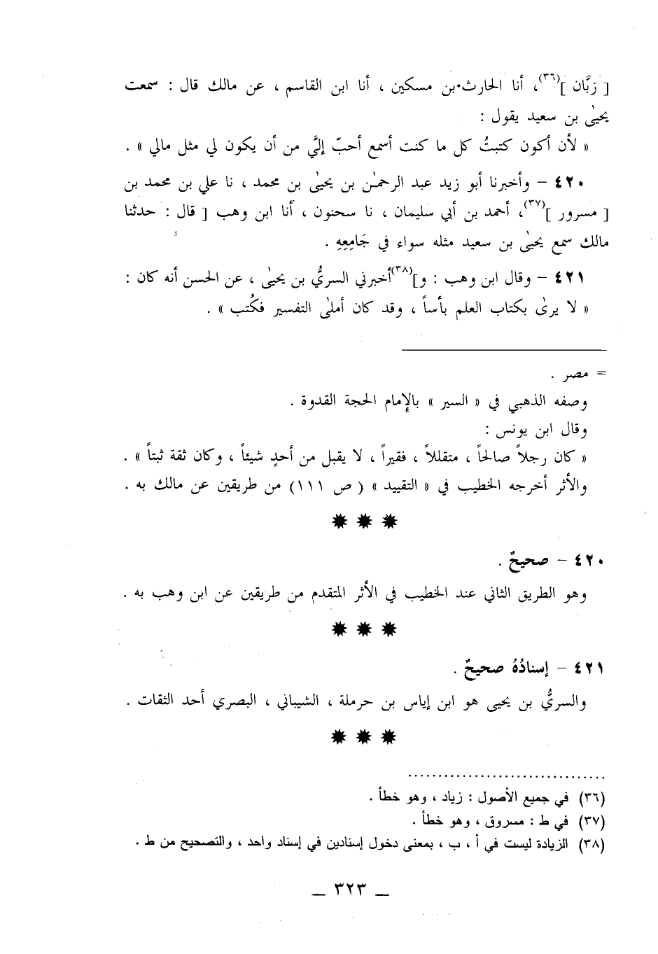 421 - وَقَالَ ابْنُ وَهْبٍ، وَأَخْبَرَنِي السَّرِيُّ بْنُ يَحْيَى، عَنِ الْحَسَنِ «أَنَّهُ كَانَ §لَا يَرَى بِكِتَابِ الْعِلْمِ بَأْسًا، وَقَدْ كَانَ أَمْلَى التَّفْسِيرَ فَكُتِبَ»