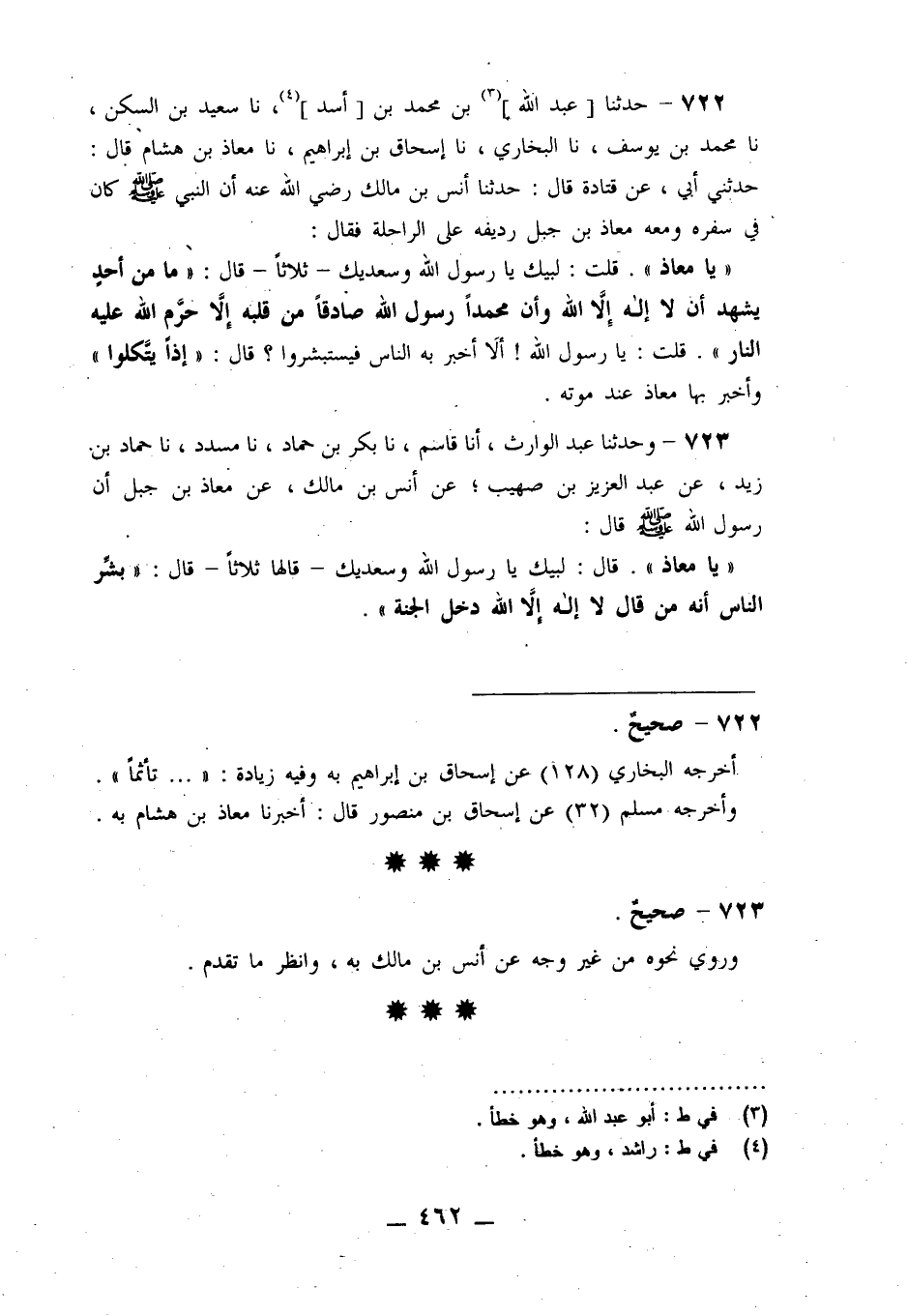 722 - حَدَّثَنَا عَبْدُ اللَّهِ بْنُ مُحَمَّدِ بْنِ أَسَدٍ، نا سَعِيدُ بْنُ السَّكَنِ، نا مُحَمَّدُ بْنُ يُوسُفَ، نا الْبُخَارِيُّ، نا إِسْحَاقُ بْنُ إِبْرَاهِيمَ، نا مُعَاذُ بْنُ هِشَامٍ قَالَ: حَدَّثَنِي أَبِي، عَنْ قَتَادَةَ قَالَ: حَدَّثَنَا أَنَسُ بْنُ مَالِكٍ رَضِيَ اللَّهُ عَنْهُ، أَنَّ النَّبِيَّ صَلَّى اللَّهُ عَلَيْهِ وَسَلَّمَ كَانَ فِي سَفَرِهِ وَمَعَهُ مُعَاذُ بْنُ جَبَلٍ رَدِيفَهُ عَلَى الرَّاحِلَةِ فَقَالَ: «يَا مُعَاذُ» قُلْتُ: لَبَّيْكَ يَا رَسُولَ اللَّهِ وَسَعْدَيْكَ ثَلَاثًا قَالَ: §«مَا مِنْ أَحَدٍ يَشْهَدُ أَنْ لَا إِلَهَ إِلَّا اللَّهُ وَأَنَّ مُحَمَّدًا رَسُولُ اللَّهِ صَادِقًا مِنْ قَلْبِهِ إِلَّا حَرَّمَ اللَّهُ عَلَيْهِ النَّارَ» قُلْتُ: يَا رَسُولَ اللَّهِ، أَلَا أُخْبِرُ بِهِ النَّاسَ فَيَسْتَبْشِرُوا قَالَ: «إِذًا يَتَّكِلُوا» وَأَخْبَرَ بِهَا مُعَاذٌ عِنْدَ مَوْتِهِ