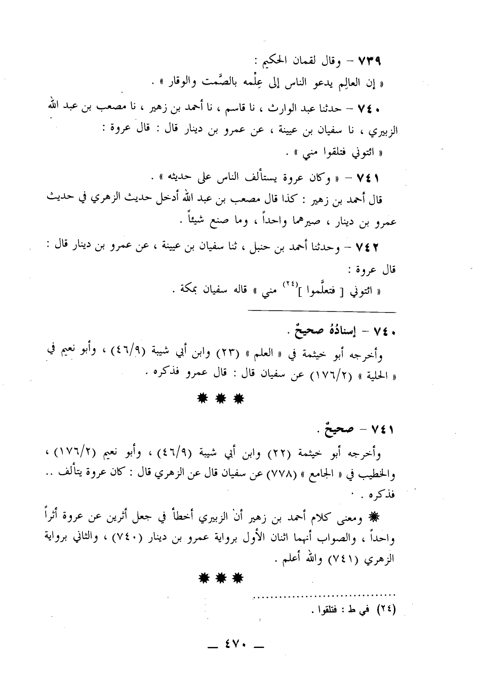 741 - «وَكَانَ عُرْوَةُ يَسْتَأْلِفُ النَّاسَ عَلَى حَدِيثِهِ» قَالَ أَحْمَدُ بْنُ زُهَيْرٍ: «كَذَا قَالَ مُصْعَبُ بْنُ عَبْدِ اللَّهِ، أَدْخَلَ حَدِيثَ الزُّهْرِيِّ فِي حَدِيثِ عَمْرِو بْنِ دِينَارٍ صَيَّرَهُمَا وَاحِدًا وَمَا صَنَعَ شَيْئًا»