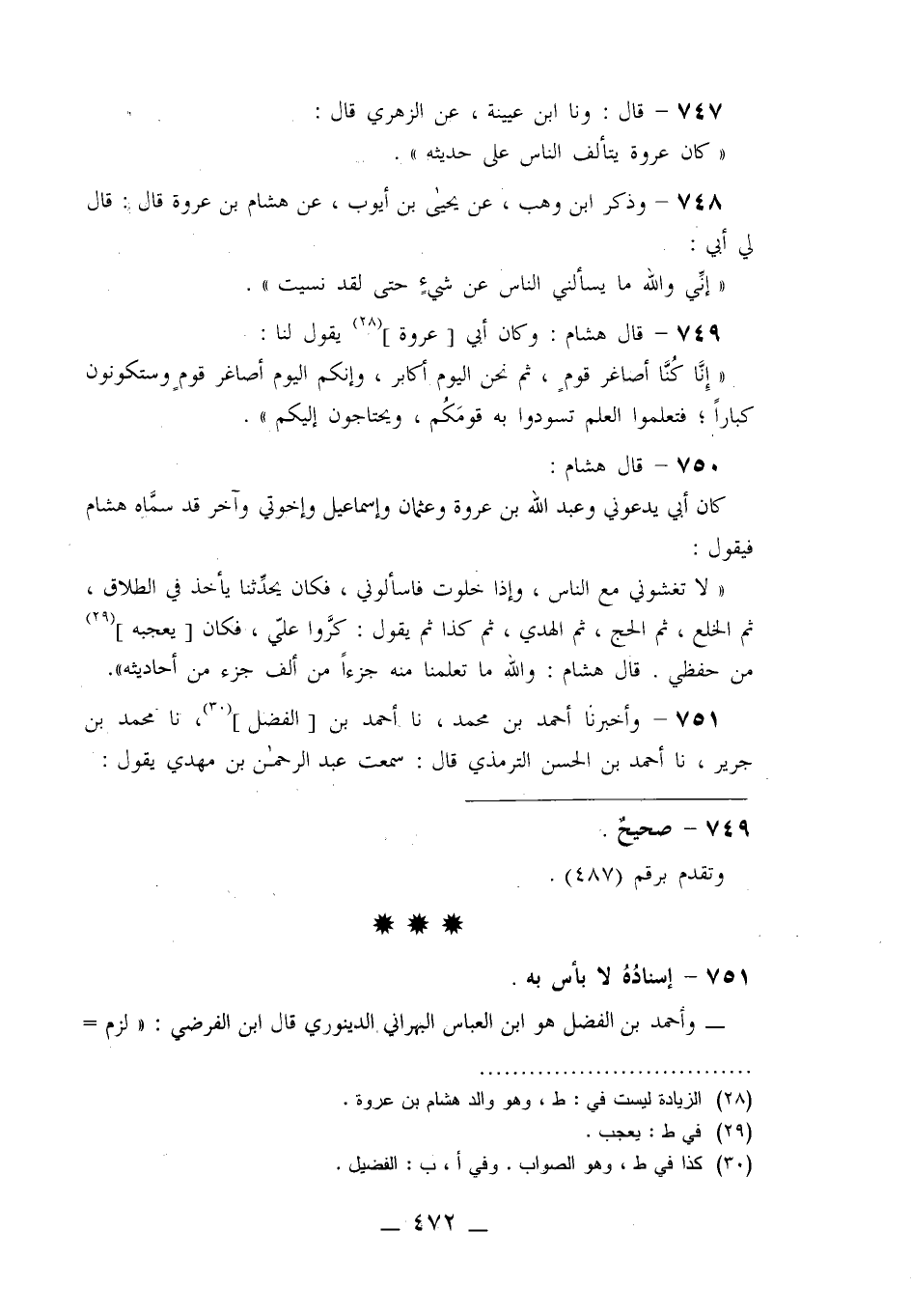 747 - قَالَ: وَنا ابْنُ عُيَيْنَةَ، عَنِ الزُّهْرِيِّ قَالَ: «كَانَ §عُرْوَةُ يَتَأَلَّفُ النَّاسَ عَلَى حَدِيثِهِ»