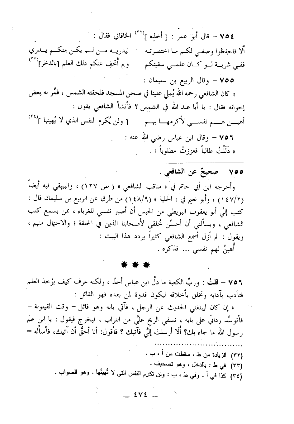 755 - وَقَالَ الرَّبِيعُ بْنُ سُلَيْمَانَ، كَانَ الشَّافِعِيُّ رَحِمَهُ اللَّهُ يُمْلِي عَلَيْنَا فِي صَحْنِ الْمَسْجِدِ فَلَحِقَتْهُ الشَّمْسُ فَمَرَّ بِهِ بَعْضُ إِخْوَانِهِ فَقَالَ: يَا أَبَا عَبْدِ اللَّهِ فِي الشَّمْسِ فَأَنْشَأَ الشَّافِعِيُّ يَقُولُ: