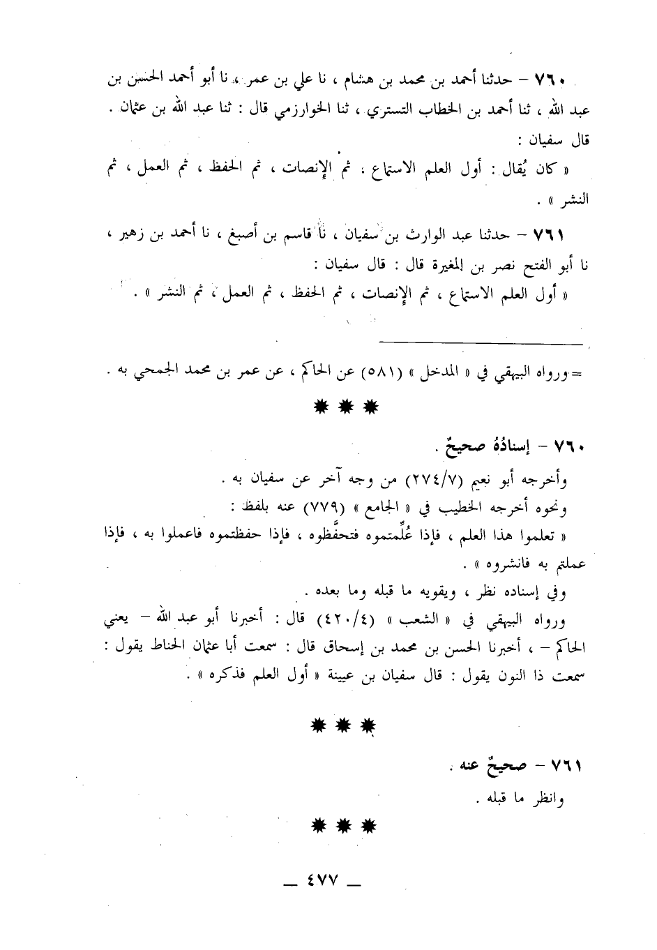761 - حَدَّثَنَا عَبْدُ الْوَارِثِ بْنُ سُفْيَانَ، نا قَاسِمُ بْنُ أَصْبَغَ، نا أَحْمَدُ بْنُ زُهَيْرٍ، نا أَبُو الْفَتْحِ نَصْرُ بْنُ الْمُغِيرَةِ، قَالَ: قَالَ سُفْيَانُ: «§أَوَّلُ الْعِلْمِ الِاسْتِمَاعُ، ثُمَّ الْإِنْصَاتُ، ثُمَّ الْحِفْظُ، ثُمَّ الْعَمَلُ، ثُمَّ النَّشْرُ»