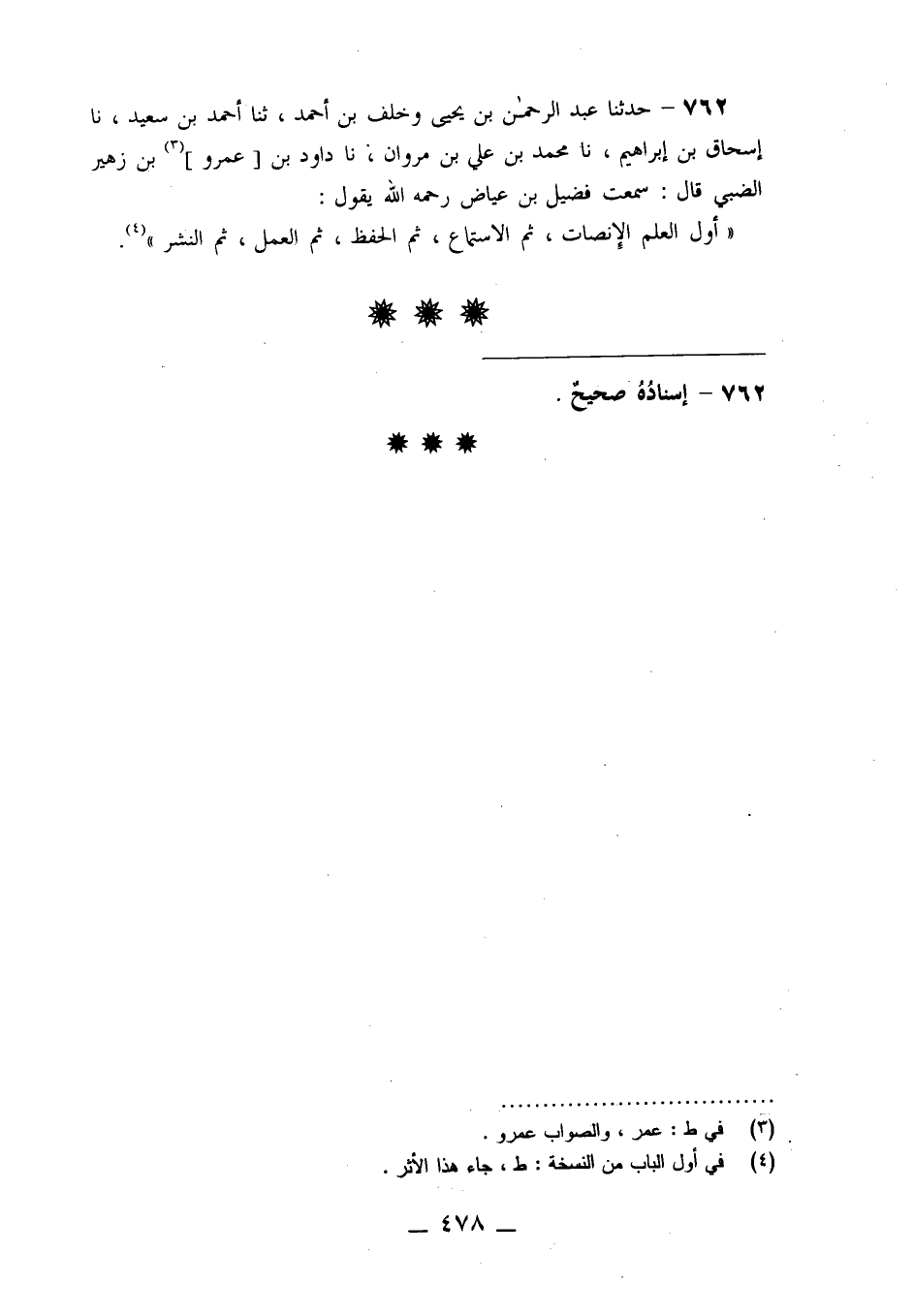 762 - حَدَّثَنَا عَبْدُ الرَّحْمَنِ بْنُ يَحْيَى، وَخَلَفُ بْنُ أَحْمَدَ ثنا أَحْمَدُ بْنُ سَعِيدٍ، نا إِسْحَاقُ بْنُ إِبْرَاهِيمَ، نا مُحَمَّدُ بْنُ عَلِيِّ بْنِ مَرْوَانَ، نا دَاوُدُ بْنُ عَمْرِو بْنِ زُهَيْرٍ الضَّبِّيُّ قَالَ: سَمِعْتُ فُضَيْلَ بْنَ عِيَاضٍ رَحِمَهُ اللَّهُ يَقُولُ: §«أَوَّلُ الْعِلْمِ الْإِنْصَاتُ ثُمَّ الِاسْتِمَاعُ ثُمَّ الْحِفْظُ ثُمَّ الْعَمَلُ ثُمَّ النَّشْرُ»