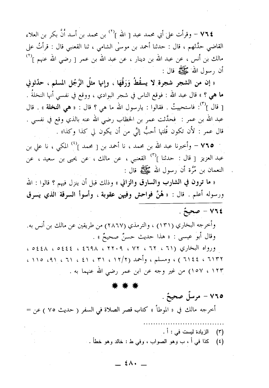 764 - وَقَرَأْتُ عَلَى أَبِي مُحَمَّدِ عَبْدِ اللَّهِ بْنِ مُحَمَّدِ بْنِ أَسَدٍ، أَنَّ بَكْرَ بْنَ الْعَلَاءِ الْقَاضِي حَدَّثَهُمْ قَالَ: حَدَّثَنَا أَحْمَدُ بْنُ مُوسَى الشَّامِيُّ ثنا الْقَعْنَبِيُّ قَالَ: قَرَأْتُ عَلَى مَالِكِ بْنِ أَنَسٍ عَنْ عَبْدِ اللَّهِ بْنِ دِينَارٍ، عَنْ عَبْدِ اللَّهِ بْنِ عُمَرَ رَضِيَ اللَّهُ عَنْهُمْ، أَنَّ رَسُولَ اللَّهِ صَلَّى اللَّهُ عَلَيْهِ وَسَلَّمَ: قَالَ: «إِنَّ §مِنَ الشَّجَرِ شَجَرَةً لَا يَسْقُطُ وَرَقُهَا وَإِنَّهَا مَثَلُ الرَّجُلِ الْمُسْلِمِ حَدِّثُونِي مَا هِيَ؟» قَالَ عَبْدُ اللَّهِ: فَوَقَعَ النَّاسُ فِي شَجَرِ الْبَوَادِي وَوَقَعَ فِي نَفْسِي أَنَّهَا النَّخْلَةُ قَالَ: فَاسْتَحْيَيْتُ فَقَالُوا: يَا رَسُولَ اللَّهِ، مَا هِيَ؟ قَالَ: هِيَ النَّخْلَةُ، قَالَ عَبْدُ اللَّهِ بْنُ عُمَرَ: فَحَدَّثْتُ عُمَرَ بْنَ الْخَطَّابِ رَضِيَ اللَّهُ عَنْهُ بِالَّذِي وَقَعَ فِي نَفْسِي، قَالَ عُمَرُ: لَأَنْ تَكُونَ قُلْتَهَا أَحَبُّ إِلَيَّ مِنْ أَنْ يَكُونَ لِي كَذَا وَكَذَا "