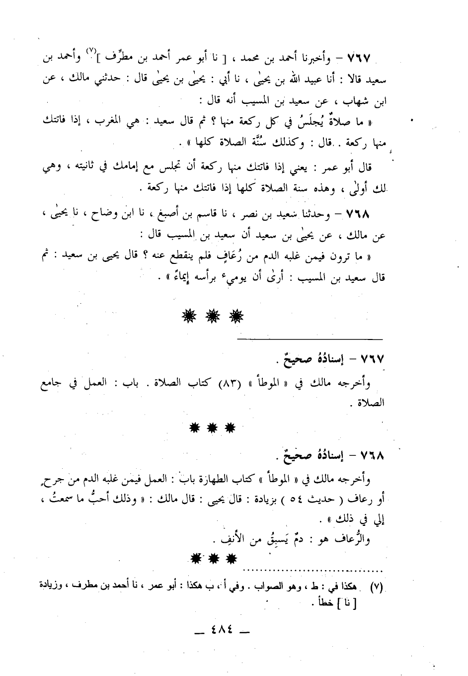 768 - وَحَدَّثَنَا سَعِيدُ بْنُ نَصْرٍ، نا قَاسِمُ بْنُ أَصْبَغَ، نا ابْنُ وَضَّاحٍ، نا يَحْيَى، عَنْ مَالِكٍ، عَنْ يَحْيَى بْنِ سَعِيدٍ، أَنَّ سَعِيدَ بْنَ الْمُسَيِّبِ قَالَ: §" مَا تَرَوْنَ فِيمَنْ غَلَبَهُ الدَّمُ مِنْ رُعَافٍ فَلَمْ يَنْقَطِعْ عَنْهُ، قَالَ يَحْيَى بْنُ سَعِيدٍ ثُمَّ قَالَ سَعِيدُ بْنُ الْمُسَيِّبِ: أَرَى أَنْ يَوْمِئَ بِرَأْسِهِ إِيمَاءً "