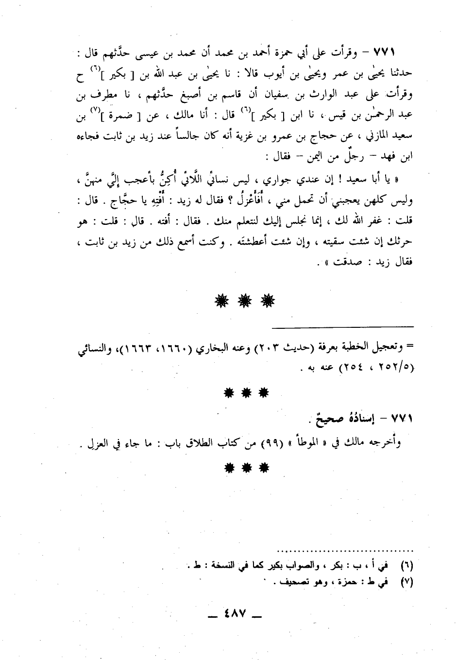 771 - وَقَرَأْتُ عَلَى أَبِي حَمْزَةَ أَحْمَدَ بْنِ مُحَمَّدٍ، أَنَّ مُحَمَّدَ بْنَ عِيسَى حَدَّثَهُمْ قَالَ: حَدَّثَنَا يَحْيَى بْنُ عُمَرَ، وَيَحْيَى بْنُ أَيُّوبَ قَالَا: نا يَحْيَى بْنُ عَبْدِ اللَّهِ بْنِ بُكَيْرٍ، ح وَقَرَأْتُ عَلَى عَبْدِ الْوَارِثِ بْنِ سُفْيَانَ، أَنَّ قَاسِمَ بْنَ أَصْبَغَ، حَدَّثَهُمْ نا مُطَرِّفُ بْنُ عَبْدِ الرَّحْمَنِ بْنِ قَيْسٍ، نا ابْنُ بُكَيْرٍ قَالَ: أنا مَالِكٌ، عَنْ ضَمْرَةَ بْنِ سَعِيدٍ الْمَازِنِيِّ، عَنْ حَجَّاجِ بْنِ عَمْرِو بْنِ غَزِيَّةَ، " أَنَّهُ كَانَ جَالِسًا عِنْدَ زَيْدِ بْنِ ثَابِتٍ فَجَاءَهُ ابْنُ فَهْدٍ؛ رَجُلٌ مِنَ الْيَمَنِ فَقَالَ: يَا أَبَا سَعِيدٍ، إِنَّ §عِنْدِي جَوَارِيَ لَيْسَ نِسَائِي اللَّائِي أُكِنُّ بِأَعْجَبَ إِلَيَّ مِنْهُنَّ وَلَيْسَ كُلُّهُنَّ يُعْجِبْنِي أَنْ تَحْمِلَ مِنِّي أَفَأَعْزِلُ؟ فَقَالَ لَهُ زَيْدٌ: أَفْتِهِ يَا حَجَّاجُ قَالَ: قُلْتُ: غَفَرَ اللَّهُ لَكَ إِنَّمَا نَجْلِسُ إِلَيْكَ لِنَتَعَلَّمَ مِنْكَ فَقَالَ: أَفْتِهِ قَالَ: قُلْتُ: هُوَ حَرْثُكَ إِنْ شِئْتَ سَقَيْتَهُ وَإِنْ شِئْتَ أَعْطَشْتَهُ وَكُنْتُ أَسْمَعُ ذَلِكَ مِنْ زَيْدِ بْنِ ثَابِتٍ فَقَالَ زَيْدٌ: صَدَقْتَ "