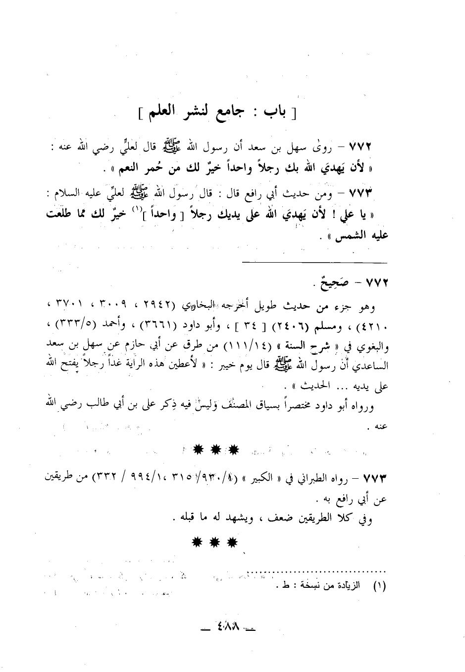 772 - رَوَى سَهْلُ بْنُ سَعْدٍ، أَنَّ رَسُولَ اللَّهِ صَلَّى اللَّهُ عَلَيْهِ وَسَلَّمَ قَالَ لِعَلِيٍّ رَضِيَ اللَّهُ عَنْهُ: «لَأَنْ يَهْدِيَ اللَّهُ بِكَ رَجُلًا وَاحِدًا خَيْرٌ لَكَ مِنْ حُمْرِ النَّعَمِ»
