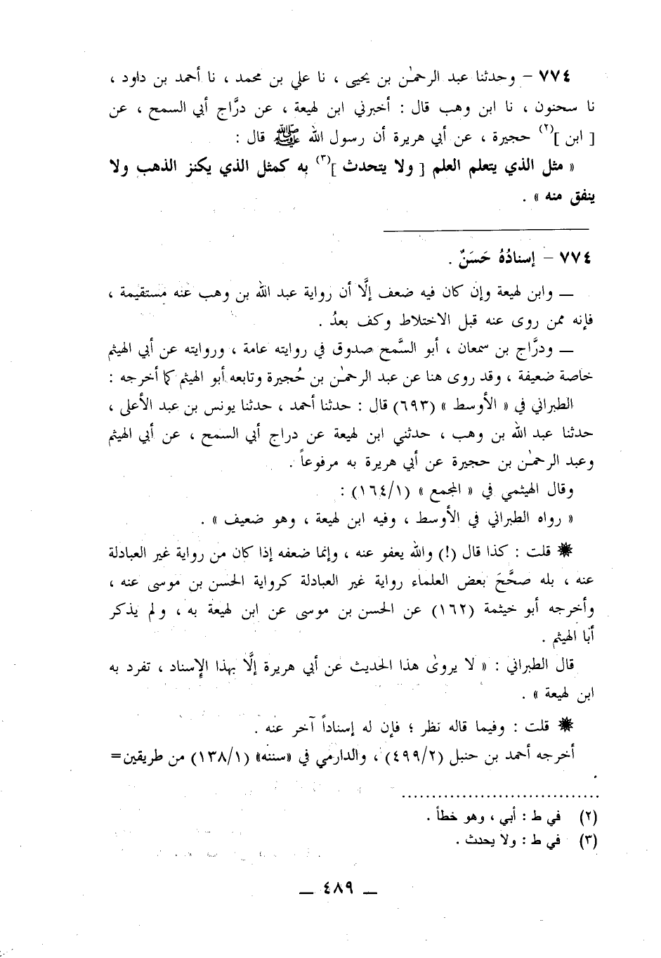774 - وَحَدَّثَنَا عَبْدُ الرَّحْمَنِ بْنُ يَحْيَى، نا عَلِيُّ بْنُ مُحَمَّدٍ، نا أَحْمَدُ بْنُ دَاوُدَ، نا سُحْنُونُ، نا ابْنُ وَهْبٍ قَالَ: أَخْبَرَنِي ابْنُ لَهِيعَةَ، عَنْ دَرَّاجٍ أَبِي السَّمْحِ، عَنِ ابْنِ حُجَيْرَةَ، عَنْ أَبِي هُرَيْرَةَ، أَنَّ رَسُولَ اللَّهِ صَلَّى اللَّهُ عَلَيْهِ وَسَلَّمَ قَالَ: §«مَثَلُ الَّذِي يَتَعَلَّمُ الْعِلْمَ وَلَا يَتَحَدَّثُ بِهِ كَمَثَلِ الَّذِي يَكْنِزُ الذَّهَبَ وَلَا يُنْفِقُ مِنْهُ»