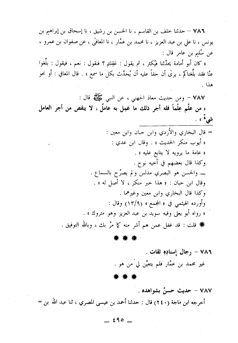 787 - وَمِنْ حَدِيثِ مُعَاذٍ الْجُهَنِيِّ عَنِ النَّبِيِّ صَلَّى اللَّهُ عَلَيْهِ وَسَلَّمَ قَالَ: «مَنْ عَلَّمَ عِلْمًا فَلَهُ أَجْرُ ذَلِكَ مَا عَمِلَ بِهِ عَامِلٌ لَا يَنْقُصُ مِنْ أَجْرِ الْعَامِلِ شَيْءٌ»