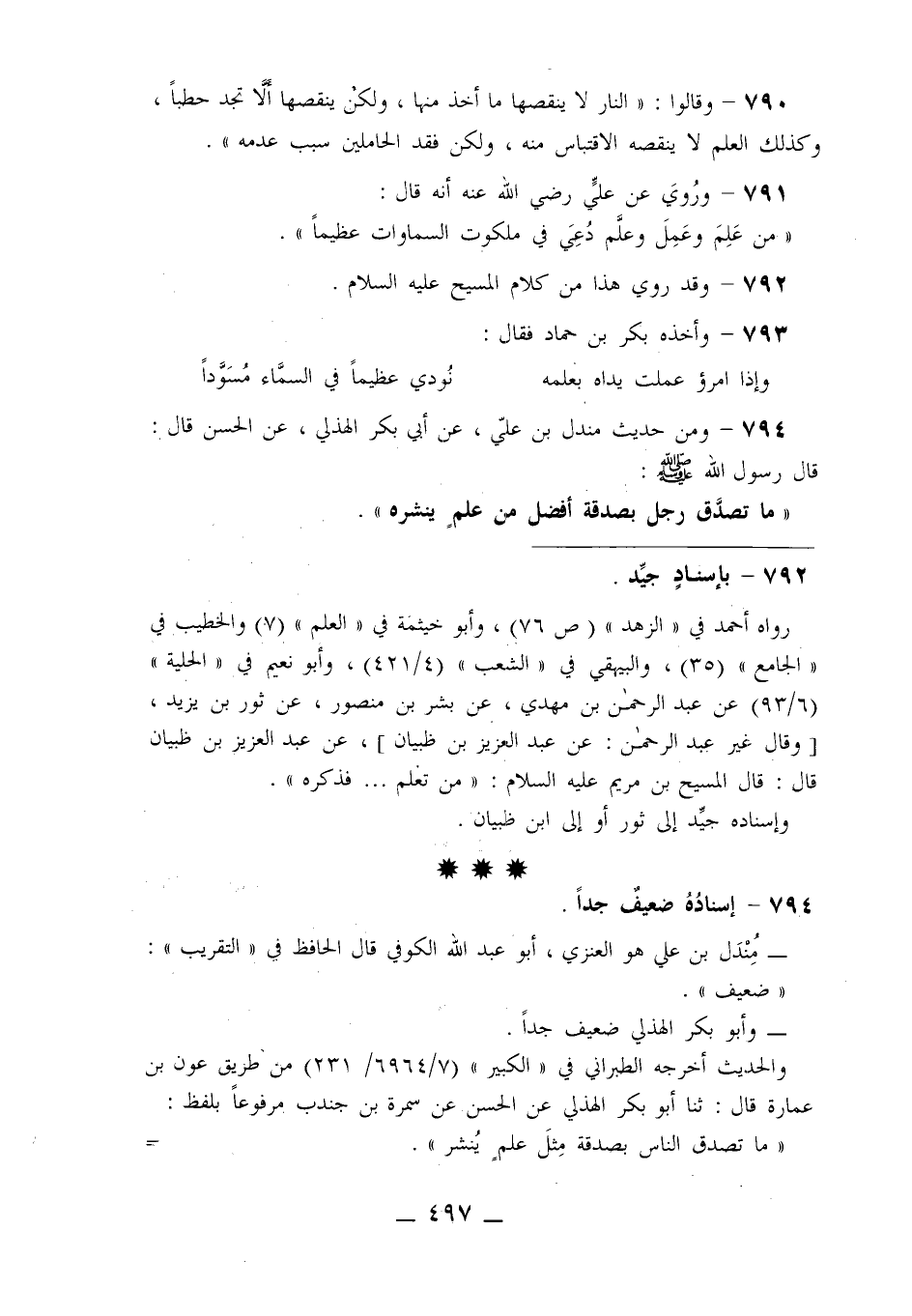 794 - وَمِنْ حَدِيثِ مِنْدَلِ بْنِ عَلِيٍّ، عَنْ أَبِي بَكْرٍ الْهُذَلِيِّ، عَنِ الْحَسَنِ قَالَ: قَالَ رَسُولُ اللَّهِ صَلَّى اللَّهُ عَلَيْهِ وَسَلَّمَ: §«مَا تَصَدَّقَ رَجُلٌ بِصَدَقَةٍ أَفْضَلَ مِنْ عِلْمٍ يَنْشُرُهُ»