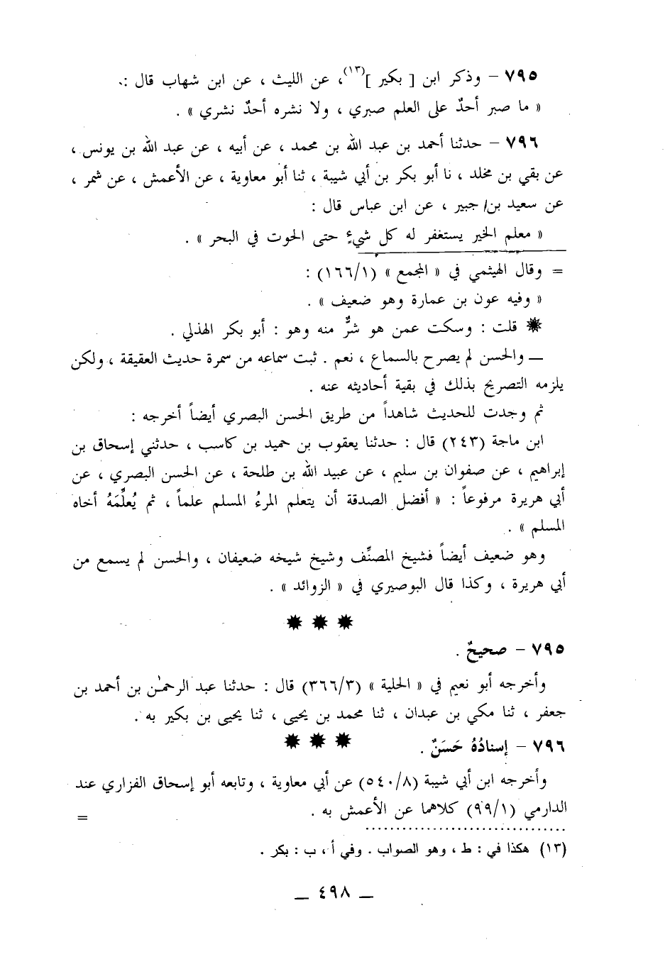 796 - حَدَّثَنَا أَحْمَدُ بْنُ عَبْدِ اللَّهِ بْنِ مُحَمَّدٍ، عَنْ أَبِيهِ، عَنْ عَبْدِ اللَّهِ بْنِ يُونُسَ، عَنْ بَقِيِّ بْنِ مَخْلَدٍ، نا أَبُو بَكْرِ بْنُ أَبِي شَيْبَةَ، ثنا أَبُو مُعَاوِيَةَ، عَنِ الْأَعْمَشِ، عَنْ شِمْرٍ، عَنْ سَعِيدِ بْنِ جُبَيْرٍ، عَنِ ابْنِ عَبَّاسٍ قَالَ: §«مُعَلِّمَ الْخَيْرِ يَسْتَغْفِرُ لَهُ كُلُّ شَيْءٍ حَتَّى الْحُوتُ فِي الْبَحْرِ» -[499]-