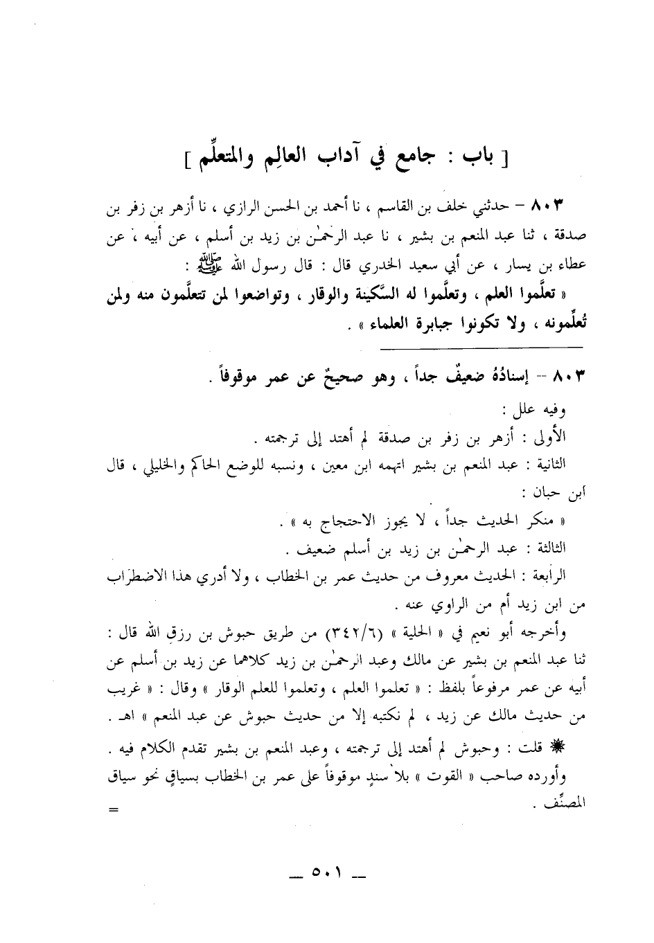 803 - حَدَّثَنِي خَلَفُ بْنُ الْقَاسِمِ، نا أَحْمَدُ بْنُ الْحَسَنِ الرَّازِيُّ، نا أَزْهَرُ بْنُ زُفَرَ بْنِ صَدَقَةَ، ثنا عَبْدُ الْمُنْعِمِ بْنُ بَشِيرٍ، نا عَبْدُ الرَّحْمَنِ بْنُ زَيْدِ بْنِ أَسْلَمَ، عَنْ أَبِيهِ، عَنْ عَطَاءِ بْنِ يَسَارٍ، عَنْ أَبِي سَعِيدٍ الْخُدْرِيِّ قَالَ: قَالَ رَسُولُ اللَّهِ صَلَّى اللَّهُ عَلَيْهِ وَسَلَّمَ: §«تَعَلَّمُوا الْعِلْمَ وَتَعَلَّمُوا لَهُ السَّكِينَةَ وَالْوَقَارَ وَتَوَاضَعُوا لِمَنْ تَتَعَلَّمُونَ مِنْهُ وَلِمَنْ تُعَلِّمُونَهُ وَلَا تَكُونُوا جَبَابِرَةَ الْعُلَمَاءِ»
