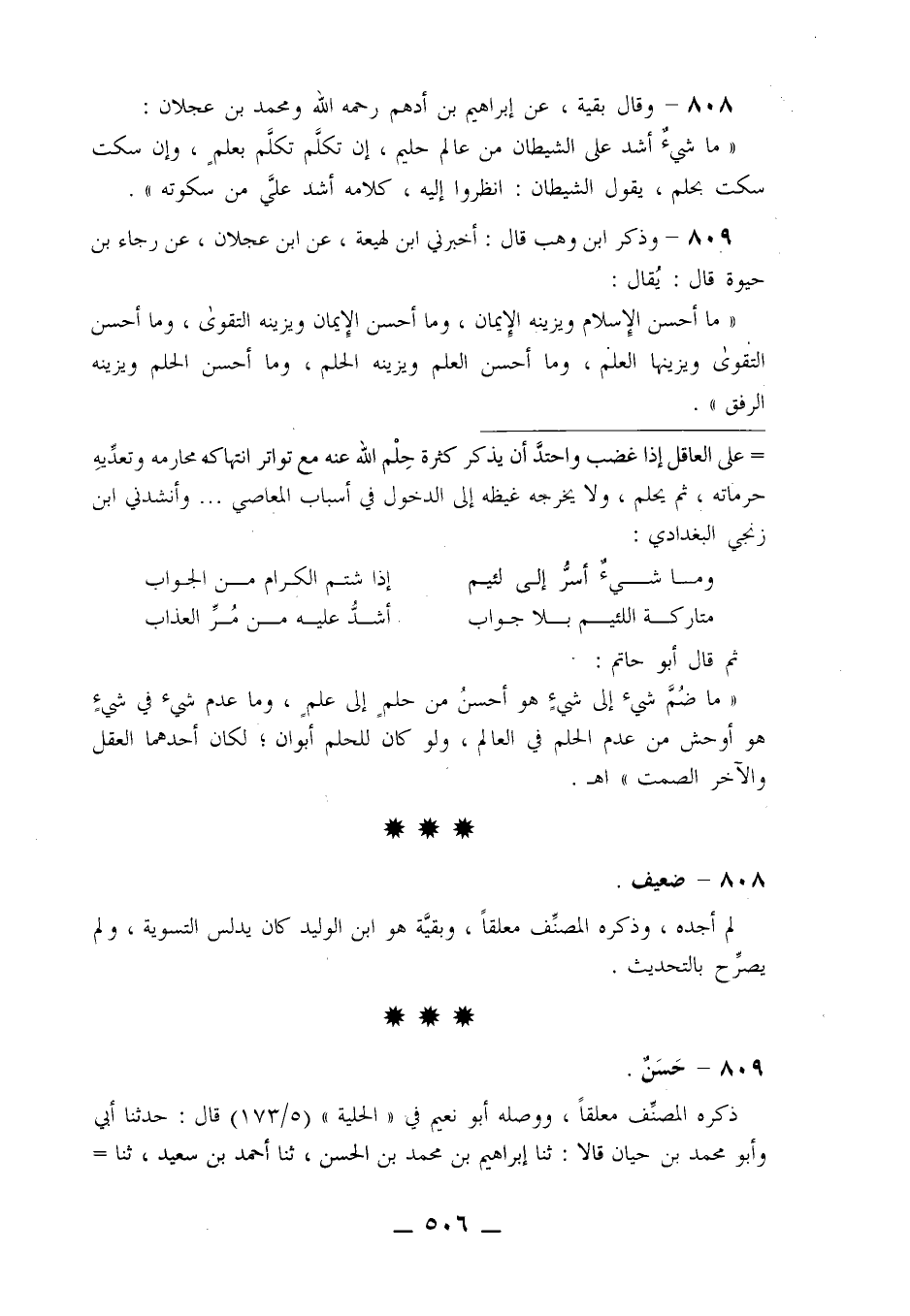 808 - وَقَالَ بَقِيَّةُ، عَنْ إِبْرَاهِيمَ بْنِ أَدْهَمَ رَحِمَهُ اللَّهُ، وَمُحَمَّدِ بْنِ عَجْلَانَ: " §مَا شَيْءٌ أَشَدُّ عَلَى الشَّيْطَانِ مِنْ عَالِمٍ حَلِيمٍ، إِنْ تَكَلَّمَ تَكَلَّمَ بِعِلْمٍ وَإِنْ سَكَتَ سَكَتَ بِحِلْمٍ يَقُولُ الشَّيْطَانُ: انْظُرُوا إِلَيْهِ كَلَامُهُ أَشَدُّ عَلَيَّ مِنْ سُكُوتِهِ "