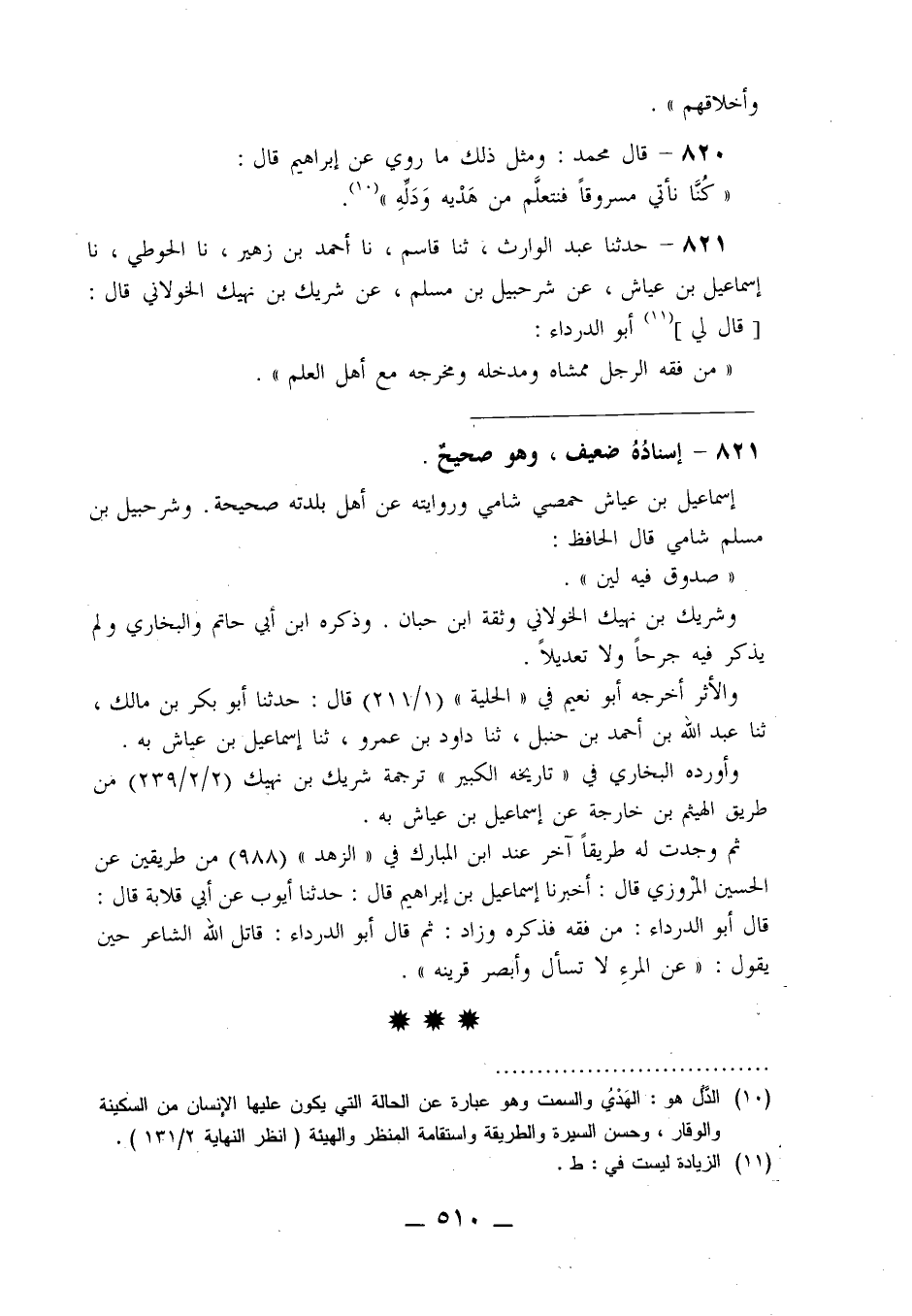821 - حَدَّثَنَا عَبْدُ الْوَارِثِ، ثنا قَاسِمٌ، نا أَحْمَدُ بْنُ زُهَيْرٍ نا الْحَوْطِيُّ، نا إِسْمَاعِيلُ بْنُ عَيَّاشٍ، عَنْ شُرَحْبِيلَ بْنِ مُسْلِمٍ، عَنْ شَرِيكِ بْنِ نَهِيكٍ الْخَوْلَانِيِّ، قَالَ: قَالَ لِي أَبُو الدَّرْدَاءِ، §«مِنْ فِقْهِ الرَّجُلِ مَمْشَاهُ وَمُدْخَلُهُ وَمُخْرَجُهُ مَعَ أَهْلِ الْعِلْمِ»