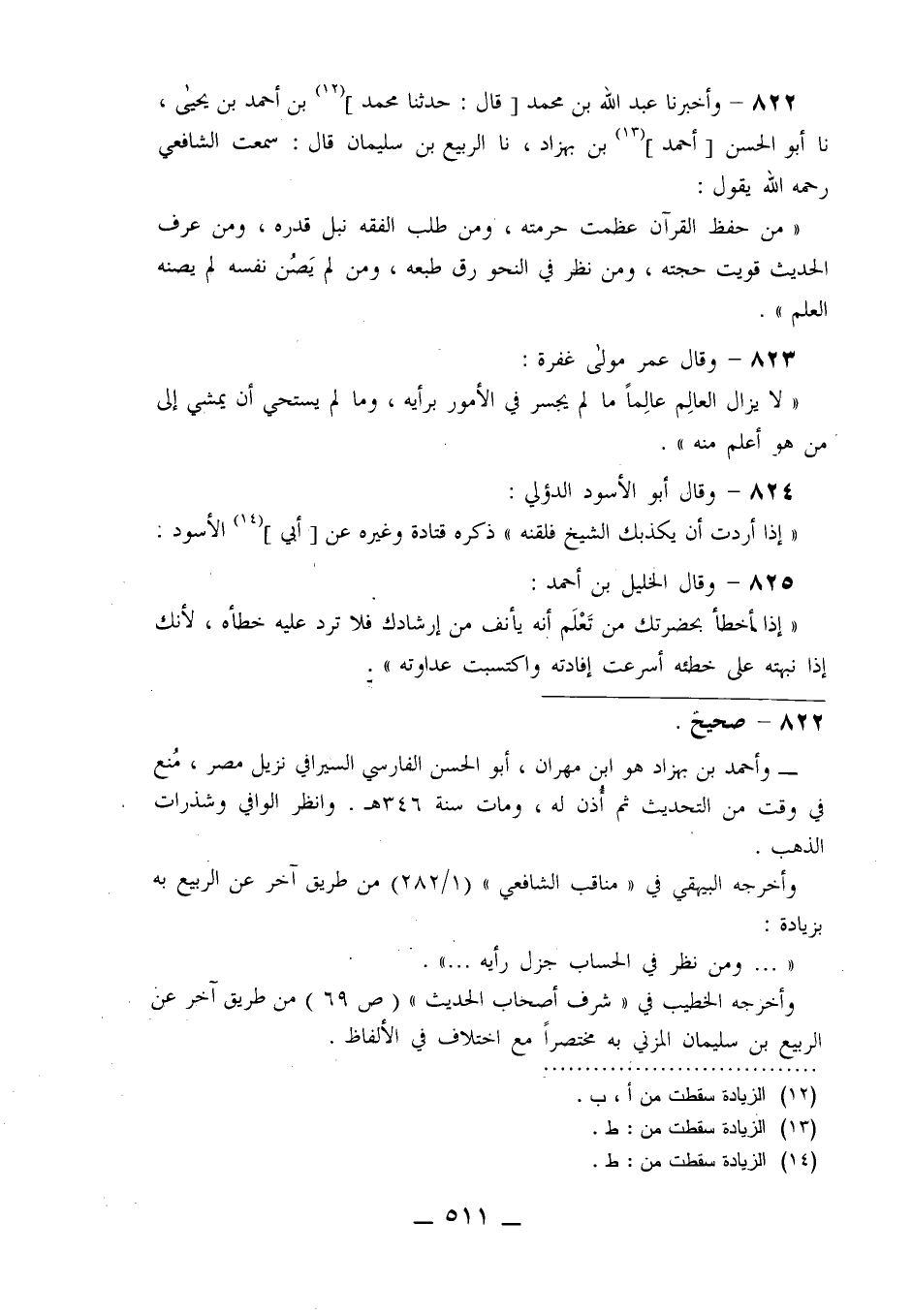 822 - وَأَخْبَرَنَا عَبْدُ اللَّهِ بْنُ مُحَمَّدٍ قَالَ: حَدَّثَنَا مُحَمَّدُ بْنُ أَحْمَدَ بْنِ يَحْيَى، نا أَبُو الْحَسَنِ أَحْمَدُ بْنُ بَهْزَادَ، نا الرَّبِيعُ بْنُ سُلَيْمَانَ قَالَ: سَمِعْتُ الشَّافِعِيَّ رَحِمَهُ اللَّهُ يَقُولُ: «§مَنْ حَفِظَ الْقُرْآنَ عَظُمَتْ حُرْمَتَهُ، وَمَنْ طَلَبَ الْفِقْهَ نَبُلَ قَدْرُهُ، وَمَنْ عَرَفَ الْحَدِيثَ قَوِيَتْ حُجَّتُهُ، وَمَنْ نَظَرَ فِي النَّحْوِ رَقَّ طَبْعُهُ، وَمَنْ لَمْ يَصُنْ نَفْسَهُ لَمْ يَصُنْهُ الْعِلْمُ»