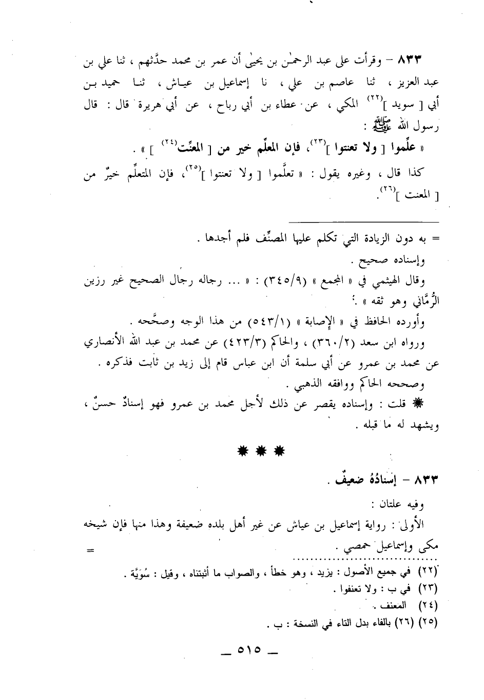 833 - وَقَرَأْتُ عَلَى عَبْدِ الرَّحْمَنِ بْنِ يَحْيَى، أَنَّ عُمَرَ بْنَ مُحَمَّدٍ حَدَّثَهُمْ، ثنا عَلِيُّ بْنُ عَبْدِ الْعَزِيزِ، ثنا عَاصِمُ بْنُ عَلِيٍّ، نا إِسْمَاعِيلُ بْنُ عَيَّاشٍ، ثنا حُمَيْدُ بْنُ أَبِي سُوَيْدٍ الْمَكِّيُّ، عَنْ عَطَاءِ بْنِ أَبِي رَبَاحٍ، عَنْ أَبِي هُرَيْرَةَ قَالَ: قَالَ رَسُولُ اللَّهِ صَلَّى اللَّهُ عَلَيْهِ وَسَلَّمَ: §«عَلِّمُوا وَلَا تُعَنِّتُوا؛ فَإِنَّ الْمُعَلِّمَ خَيْرٌ مِنَ الْمُعَنِّتِ» كَذَا قَالَ، وَغَيْرُهُ يَقُولُ: «تَعَلَّمُوا وَلَا تَعَنَّتُوا فَإِنَّ الْمُتَعَلِّمَ خَيْرٌ مِنَ الْمُعَنِّتِ»