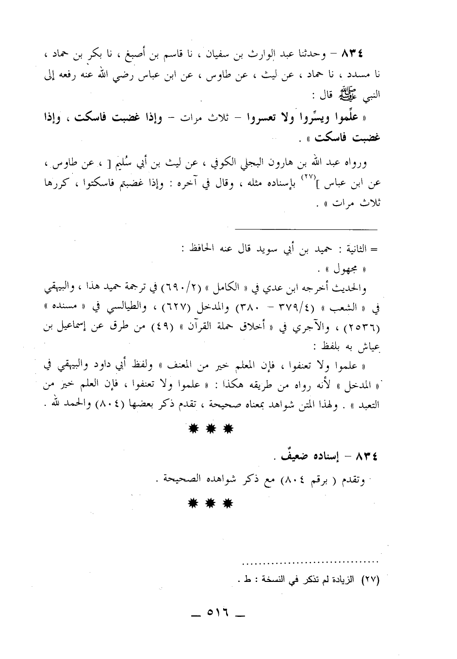 834 - وَحَدَّثَنَا عَبْدُ الْوَارِثِ بْنُ سُفْيَانَ، نا قَاسِمُ بْنُ أَصْبَغَ، نا بَكْرُ بْنُ حَمَّادٍ، نا مُسَدَّدٌ، نا حَمَّادٌ، عَنْ لَيْثٍ، عَنْ طَاوُسٍ، عَنِ ابْنِ عَبَّاسٍ رَضِيَ اللَّهُ عَنْهُ، رَفَعَهُ إِلَى النَّبِيِّ صَلَّى اللَّهُ عَلَيْهِ وَسَلَّمَ قَالَ: «§عَلِّمُوا وَيَسِّرُوا، وَلَا تُعَسِّرُوا» ثَلَاثَ مَرَّاتٍ «وَإِذَا غَضِبْتَ فَاسْكُتْ , وَإِذَا غَضِبْتَ فَاسْكُتْ» وَرَوَاهُ عَبْدُ اللَّهِ بْنُ هَارُونَ الْبَجَلِيُّ الْكُوفِيُّ عَنْ لَيْثِ بْنِ أَبِي سُلَيْمٍ عَنْ طَاوُسٍ، عَنِ ابْنِ عَبَّاسٍ، بِإِسْنَادِهِ مِثْلَهُ، وَقَالَ فِي آخِرِهِ «وَإِذَا غَضِبْتُمْ فَاسْكُتُوا» كَرَّرَهَا ثَلَاثَ مَرَّاتٍ