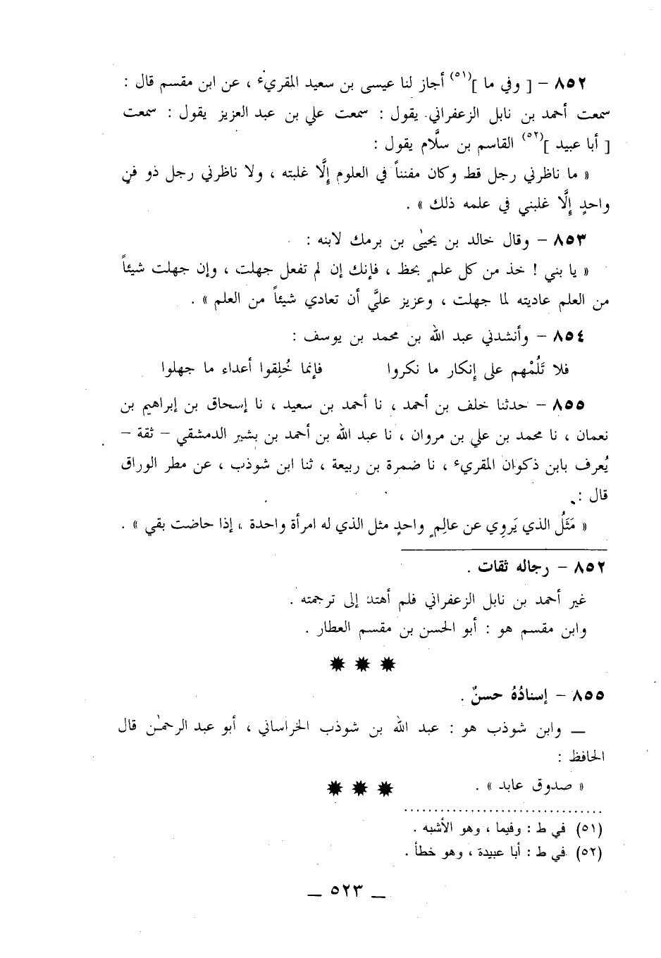 852 - وَفِي مَا أَجَازَ لَنَا عِيسَى بْنُ سَعِيدٍ الْمُقْرِئُ، عَنِ ابْنِ مِقْسَمٍ قَالَ: سَمِعْتُ أَحْمَدَ بْنَ نَابِلٍ الزَّعْفَرَانِيَّ يَقُولُ: سَمِعْتُ عَلِيَّ بْنَ عَبْدِ الْعَزِيزِ يَقُولُ: سَمِعْتُ أَبَا عُبَيْدٍ الْقَاسِمَ بْنَ سَلَّامٍ يَقُولُ: §«مَا نَاظَرَنِي رَجُلٍ قَطُّ وَكَانَ مُفَنِّنًا فِي الْعُلُومِ إِلَّا غَلَبْتُهُ، وَلَا نَاظَرَنِي رَجُلٌ ذُو فَنٍّ وَاحِدٍ إِلَّا غَلَبَنِي فِي عِلْمِهِ ذَلِكَ»