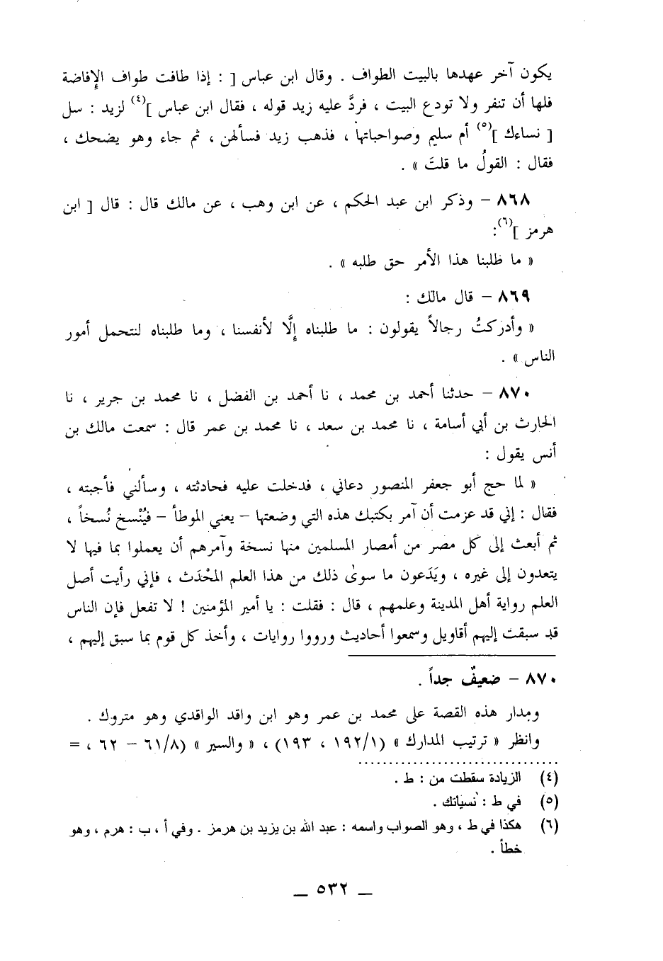 870 - حَدَّثَنَا أَحْمَدُ بْنُ مُحَمَّدٍ، نا أَحْمَدُ بْنُ الْفَضْلِ، نا مُحَمَّدُ بْنُ جَرِيرٍ، نا الْحَارِثُ بْنُ أَبِي أُسَامَةَ، نا مُحَمَّدُ بْنُ سَعْدٍ، نا مُحَمَّدُ بْنُ عُمَرَ قَالَ: سَمِعْتُ مَالِكَ بْنَ أَنَسٍ يَقُولُ: " لَمَّا حَجَّ أَبُو جَعْفَرٍ الْمَنْصُورُ دَعَانِي فَدَخَلْتُ عَلَيْهِ فَحَدَّثْتُهُ وَسَأَلَنِي فَأَجَبْتُهُ، فَقَالَ: إِنِّي قَدْ عَزَمْتُ أَنْ آمُرَ بِكُتُبِكَ هَذِهِ الَّتِي وَضَعْتَهَا - يَعْنِي الْمُوَطَّأَ - فَيُنْسَخُ نُسَخًا ثُمَّ أَبْعَثُ إِلَى كُلِّ مِصْرٍ مِنْ أَمْصَارِ الْمُسْلِمِينَ مِنْهَا نُسْخَةً وَآمُرُهُمْ أَنْ يَعْمَلُوا بِمَا فِيهَا لَا يَتَعَدَّوْنَ إِلَى غَيْرِهِ , وَيَدَعُونَ مَا سِوَى ذَلِكَ مِنْ هَذَا الْعِلْمِ الْمُحْدَثِ؛ فَإِنِّي رَأَيْتُ أَصْلَ الْعِلْمِ رِوَايَةَ أَهْلِ الْمَدِينَةِ وَعِلْمَهُمْ قَالَ: فَقُلْتُ: " يَا أَمِيرَ الْمُؤْمِنِينَ، لَا تَفْعَلْ فَإِنَّ §النَّاسَ قَدْ سَبَقَتْ إِلَيْهِمْ أَقَاوِيلُ وَسَمِعُوا أَحَادِيثَ وَرَوَوْا رِوَايَاتٍ وَأَخَذَ كُلُّ قَوْمٍ بِمَا سَبَقَ إِلَيْهِمْ -[533]- وَعَمِلُوا بِهِ وَدَانُوا بِهِ مِنَ اخْتِلَافِ النَّاسِ أَصْحَابَ رَسُولِ اللَّهِ صَلَّى اللَّهُ عَلَيْهِ وَسَلَّمَ وَغَيْرَهُمْ، وَإِنَّ رَدَّهُمْ عَمَّا اعْتَقَدُوهُ شَدِيدٌ، فَدَعِ النَّاسَ وَمَا هُمْ عَلَيْهِ وَمَا اخْتَارَ كُلُّ أَهْلِ بَلَدٍ لِأَنْفُسِهِمْ، فَقَالَ: لَعَمْرِي لَوْ طَاوَعْتَنِي عَلَى ذَلِكَ لَأَمَرْتُ بِهِ وَهَذَا غَايَةٌ فِي الْإِنْصَافِ لِمَنْ فَهِمَ "