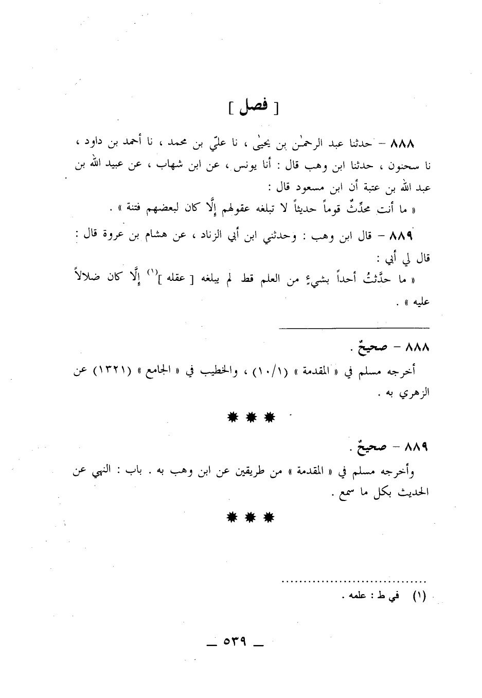 888 - حَدَّثَنَا عَبْدُ الرَّحْمَنِ بْنُ يَحْيَى، نا عَلِيُّ بْنُ مُحَمَّدٍ، نا أَحْمَدُ بْنُ دَاوُدَ، نا سُحْنُونُ، حَدَّثَنَا ابْنُ وَهْبٍ قَالَ: أنا يُونُسُ، عَنِ ابْنِ شِهَابٍ، عَنْ عُبَيْدِ اللَّهِ بْنِ عَبْدِ اللَّهِ بْنِ عُتْبَةَ، أَنَّ ابْنَ مَسْعُودٍ، قَالَ: §«مَا أَنْتَ مُحَدِّثٌ قَوْمًا حَدِيثًا لَا تَبْلُغُهُ عُقُولُهُمْ إِلَّا كَانَ لِبَعْضِهِمْ فِتْنَةً»
