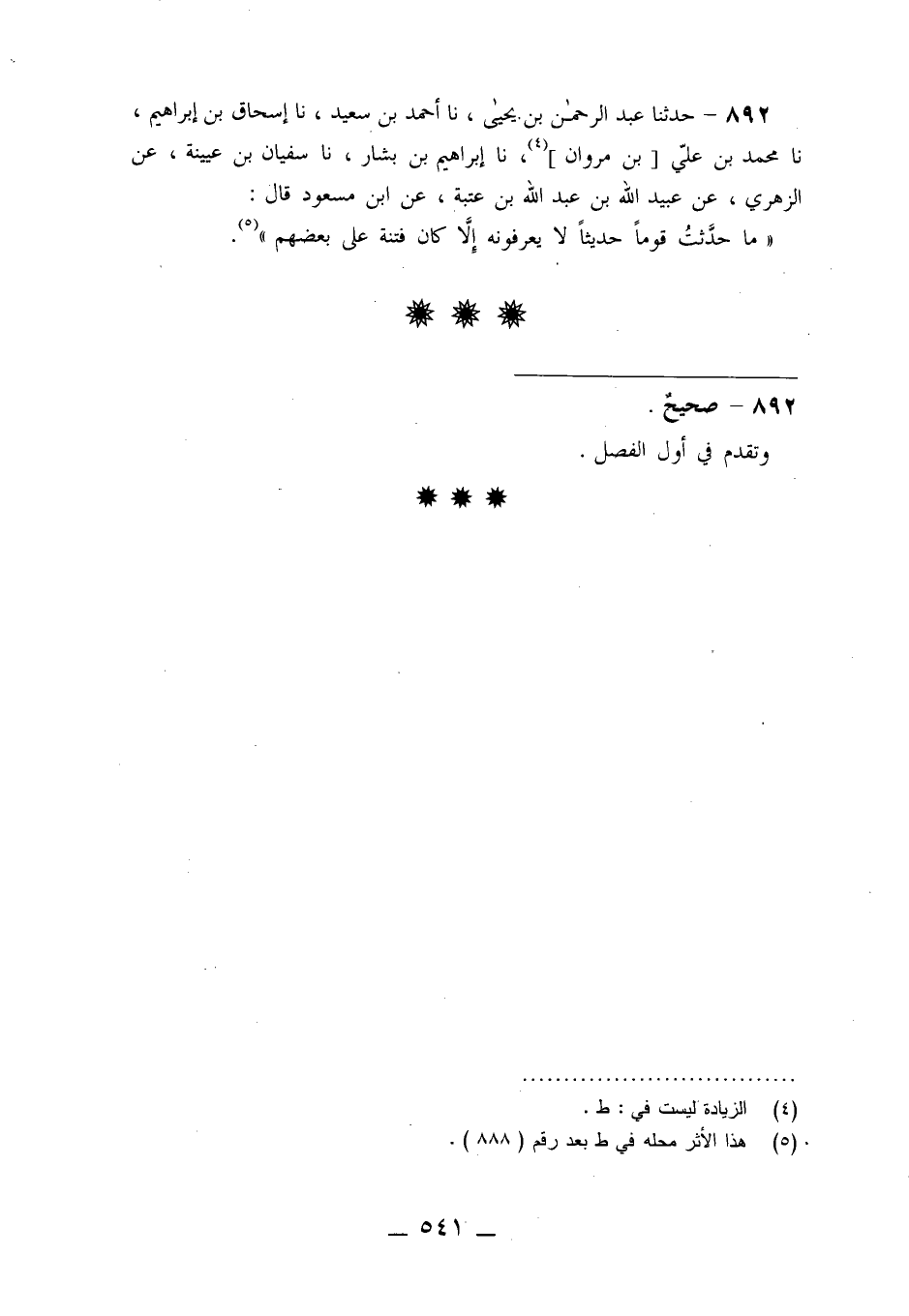 892 - حَدَّثَنَا عَبْدُ الرَّحْمَنِ بْنُ يَحْيَى، نا أَحْمَدُ بْنُ سَعِيدٍ، نا إِسْحَاقُ بْنُ إِبْرَاهِيمَ، نا مُحَمَّدُ بْنُ عَلِيِّ بْنِ مَرْوَانَ، نا إِبْرَاهِيمُ بْنُ بَشَّارٍ، نا سُفْيَانُ بْنُ عُيَيْنَةَ، عَنِ الزُّهْرِيِّ، عَنْ عُبَيْدِ اللَّهِ بْنِ عَبْدِ اللَّهِ بْنِ عُتْبَةَ، عَنِ ابْنِ مَسْعُودٍ قَالَ: «§مَا حَدَّثْتَ قَوْمًا، حَدِيثًا لَا يَعْرِفُونَهُ إِلَّا كَانَ فِتْنَةً عَلَى بَعْضِهِمْ»