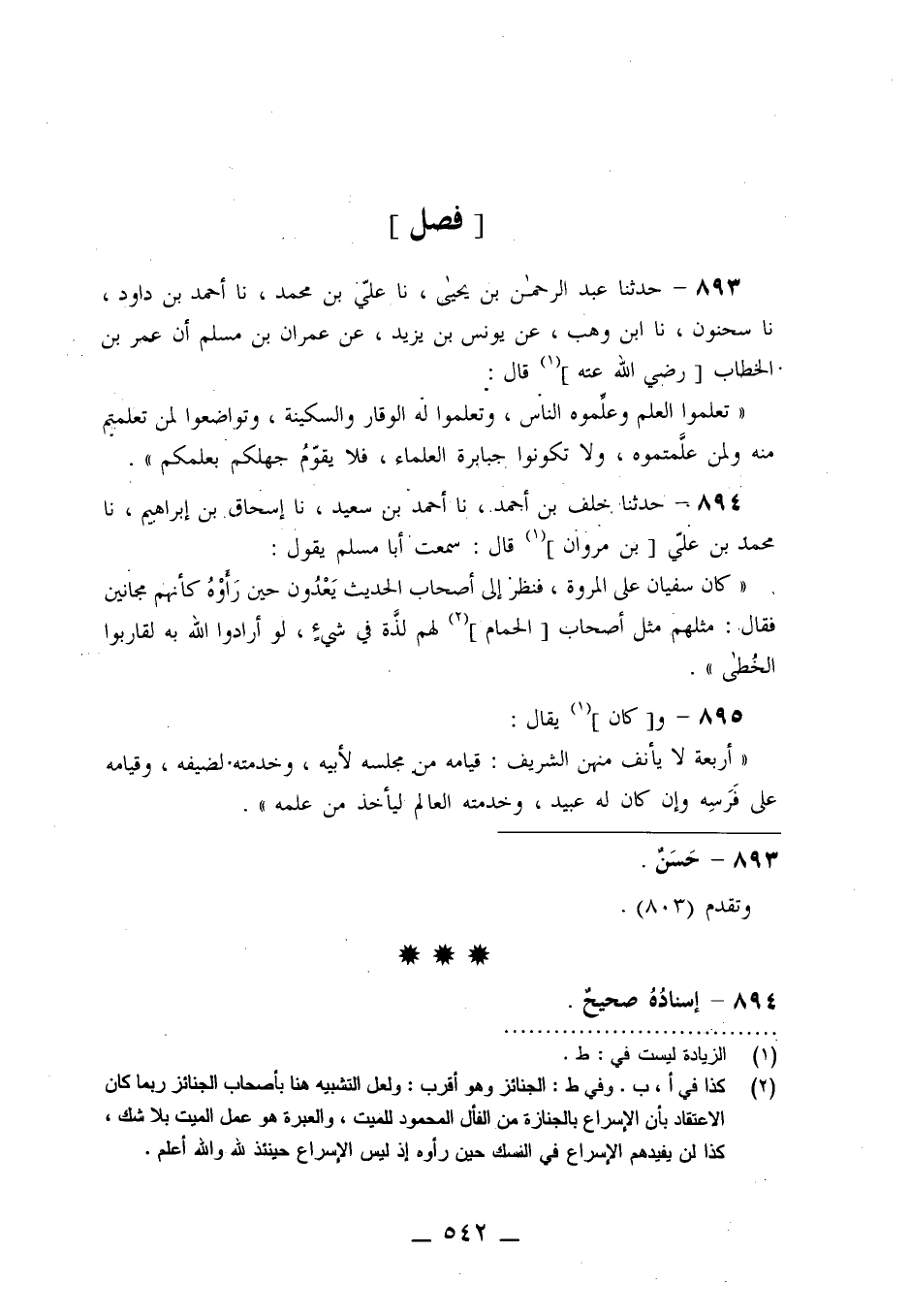 895 - وَكَانَ يُقَالُ: " أَرْبَعَةٌ لَا يَأْنَفُ مِنْهُنَّ الشَّرِيفُ: قِيَامُهُ مِنْ مَجْلِسِهِ لِأَبِيهِ، وَخِدْمَتُهُ لِضَيْفِهِ، وَقِيَامُهُ عَلَى فَرَسِهِ، وَإِنْ كَانَ لَهُ عَبِيدٌ وَخِدْمَتُهُ الْعَالِمَ لِيَأْخُذَ مِنْ عِلْمِهِ " -[543]-