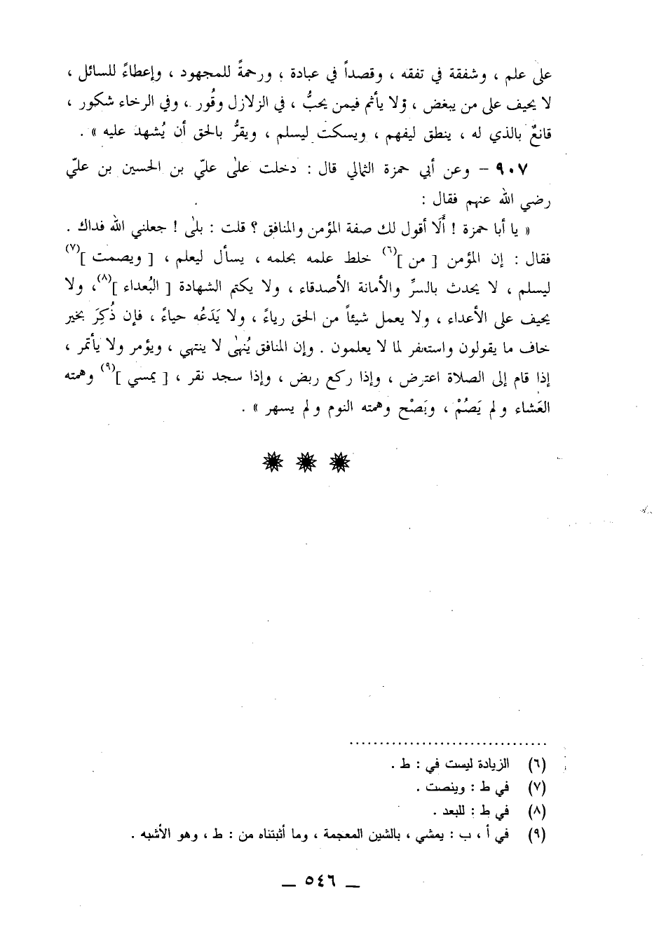 907 - وَعَنْ أَبِي حَمْزَةَ الثُّمَالِيِّ قَالَ: دَخَلْتُ عَلَى عَلِيِّ بْنِ الْحُسَيْنِ بْنِ عَلِيٍّ رَضِيَ اللَّهُ عَنْهُمْ، فَقَالَ: «يَا أَبَا حَمْزَةَ أَلَا §أَقُولُ لَكَ صِفَةَ الْمُؤْمِنِ وَالْمُنَافِقِ؟» قُلْتُ: بَلَى جَعَلَنِي اللَّهُ فِدَاكَ , فَقَالَ: «إِنَّ الْمُؤْمِنَ مَنْ خَلَطَ عِلْمَهُ بِحِلْمِهِ، يَسْأَلُ لِيَعْلَمَ، وَيَصْمُتُ لِيَسْلَمَ، لَا يُحَدِّثُ بِالسِّرِّ وَالْأَمَانَةِ الْأَصْدِقَاءَ، وَلَا يَكْتُمُ الشَّهَادَةَ الْبُعَدَاءَ، وَلَا يَحِيفُ عَلَى الْأَعْدَاءِ، وَلَا يَعْمَلُ شَيْئًا مِنَ الْحَقِّ رِيَاءً , وَلَا يَدَعُهُ حَيَاءً , فَإِنْ ذُكِرَ بِخَيْرٍ خَافَ مَا يَقُولُونَ , وَاسْتَغْفَرَ لِمَا لَا يَعْلَمُونَ , وَإِنَّ الْمُنَافِقَ يُنْهَى لَا يَنْتَهِي، وَيُؤْمَرُ وَلَا يَأْتَمِرُ , إِذَا قَامَ إِلَى الصَّلَاةِ اعْتَرَضَ , وَإِذَا رَكَعَ رَبَضَ وَإِذَا سَجَدَ نَقَرَ يُمْسِي وَهِمَّتُهُ الْعَشَاءُ , وَلَمْ يَصُمْ، وَيَصْحُ وَهِمَّتُهُ النَّوْمُ وَلَمْ يَسْهَرْ»