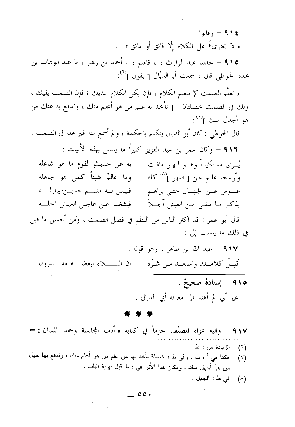 قَالَ أَبُو عُمَرَ: " قَدْ أَكْثَرَ النَّاسُ مِنَ النَّظْمِ فِي فَضْلِ الصَّمْتِ , وَمِنْ أَحْسَنِ مَا قِيلَ فِي ذَلِكَ مَا يُنْسَبُ إِلَى