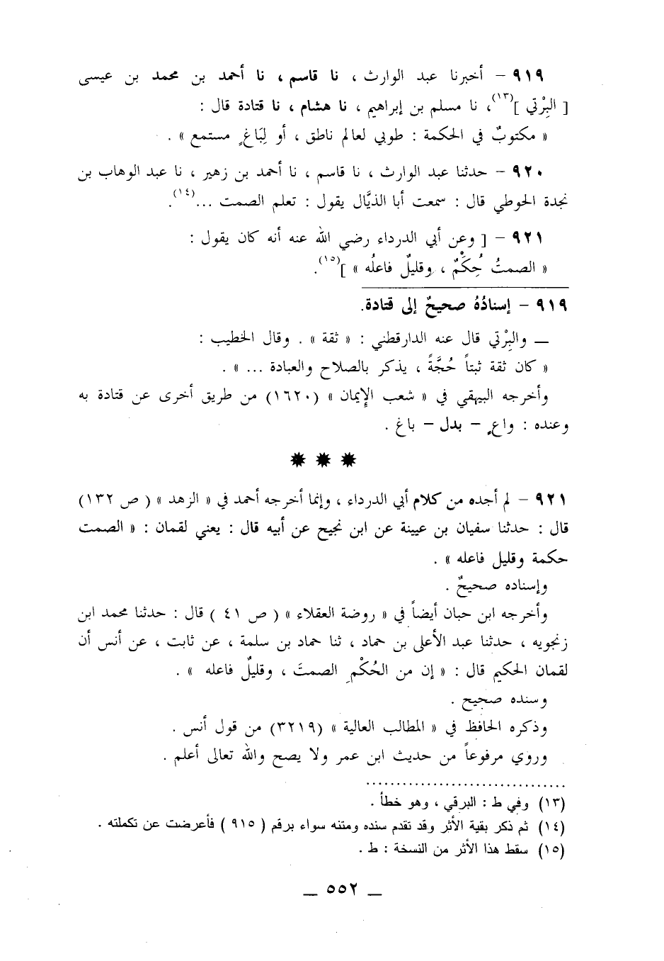 921 - وَعَنْ أَبِي الدَّرْدَاءَ رَضِيَ اللَّهُ عَنْهُ أَنَّهُ كَانَ يَقُولُ: «الصَّمْتُ حِكَمٌ وَقَلِيلٌ فَاعِلُهُ» -[553]-