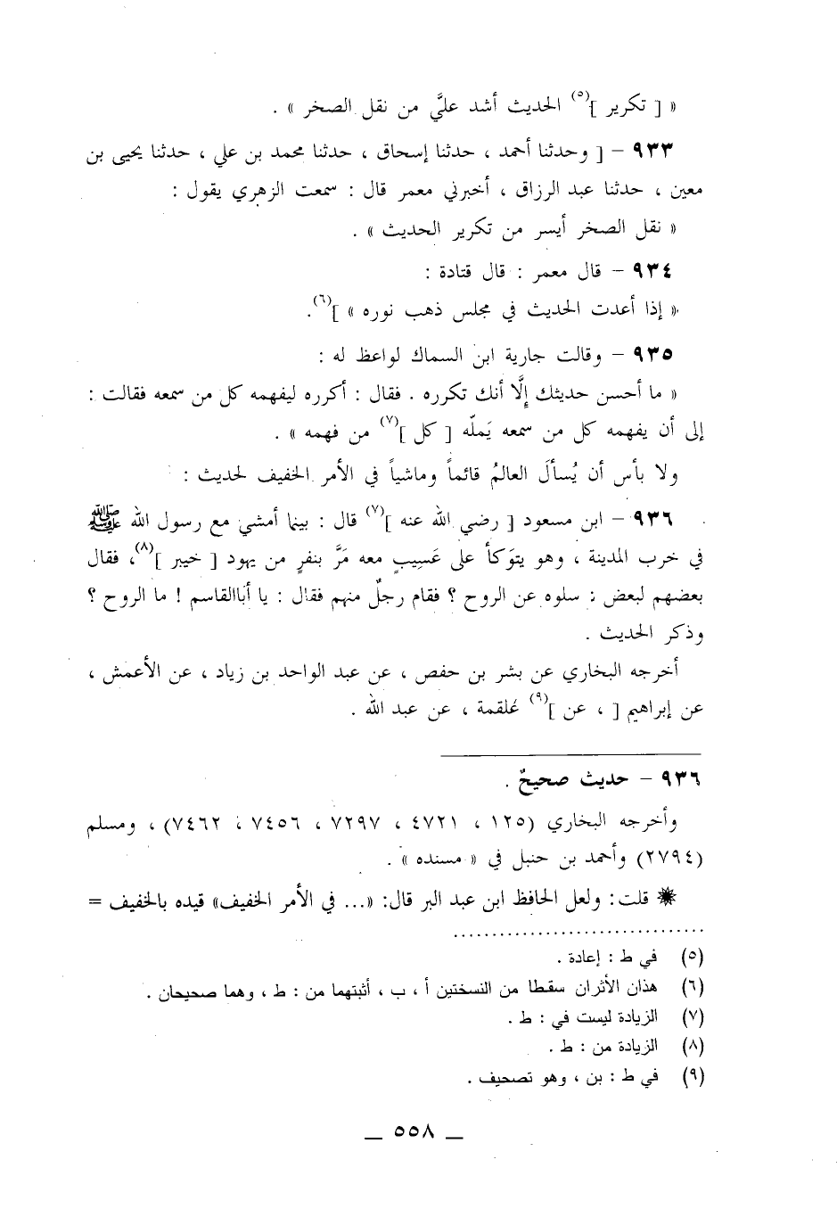 933 - وَحَدَّثَنَا أَحْمَدُ، حَدَّثَنَا إِسْحَاقُ، حَدَّثَنَا مُحَمَّدُ بْنُ عَلِيٍّ، حَدَّثَنَا يَحْيَى بْنُ مَعِينٍ، حَدَّثَنَا عَبْدُ الرَّزَّاقِ، أَخْبَرَنِي مَعْمَرٌ قَالَ: سَمِعْتُ الزُّهْرِيَّ يَقُولُ: §«نَقْلُ الصَّخْرِ أَيْسَرُ مِنْ تَكْرِيرِ الْحَدِيثِ»