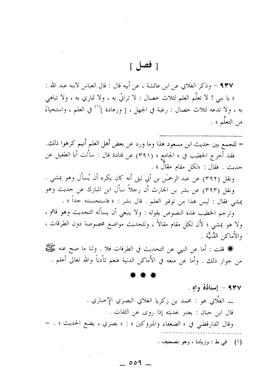 937 - وَذَكَرَ الْغِلَابِيُّ، عَنِ ابْنِ عَائِشَةَ، عَنْ أَبِيهِ قَالَ: قَالَ الْعَبَّاسُ لِابْنِهِ عَبْدِ اللَّهِ: " يَا بُنَيَّ، §لَا تَعَلَّمِ الْعِلْمَ لِثَلَاثِ خِصَالٍ: لَا تُرَائِي بِهِ وَلَا تُمَارِ بِهِ وَلَا تُبَاهِ بِهِ , وَلَا تَدَعْهُ لِثَلَاثِ خِصَالٍ: رَغْبَةٌ فِي الْجَهْلِ وَزَهَادَةٌ فِي الْعِلْمُ وَاسْتِحْيَاءٌ مِنَ التَّعَلُّمِ" -[560]-