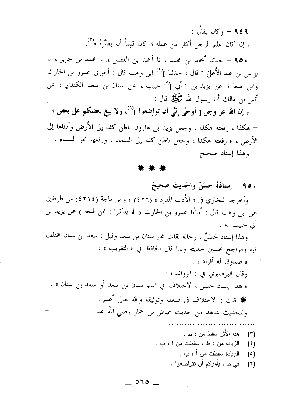 950 - حَدَّثَنَا أَحْمَدُ بْنُ مُحَمَّدٍ، نا أَحْمَدُ بْنُ الْفَضْلِ، نا مُحَمَّدُ بْنُ جَرِيرٍ، نا يُونُسُ بْنُ عَبْدِ الْأَعْلَى قَالَ: حَدَّثَنَا ابْنُ وَهْبٍ قَالَ: أَخْبَرَنِي عَمْرُو بْنُ الْحَارِثِ، وَابْنُ لَهِيعَةَ، عَنْ يَزِيدَ بْنِ أَبِي حَبِيبٍ، عَنْ سِنَانُ بْنُ سَعْدٍ الْكِنْدِيُّ، عَنْ أَنَسِ بْنِ مَالِكٍ، أَنَّ رَسُولَ اللَّهِ صَلَّى اللَّهُ عَلَيْهِ وَسَلَّمَ قَالَ: «إِنَّ §اللَّهَ عَزَّ وَجَلَّ أَوْحَى إِلَيَّ أَنْ تَوَاضَعُوا وَلَا يَبْغِ بَعْضُكُمْ عَلَى بَعْضٍ»