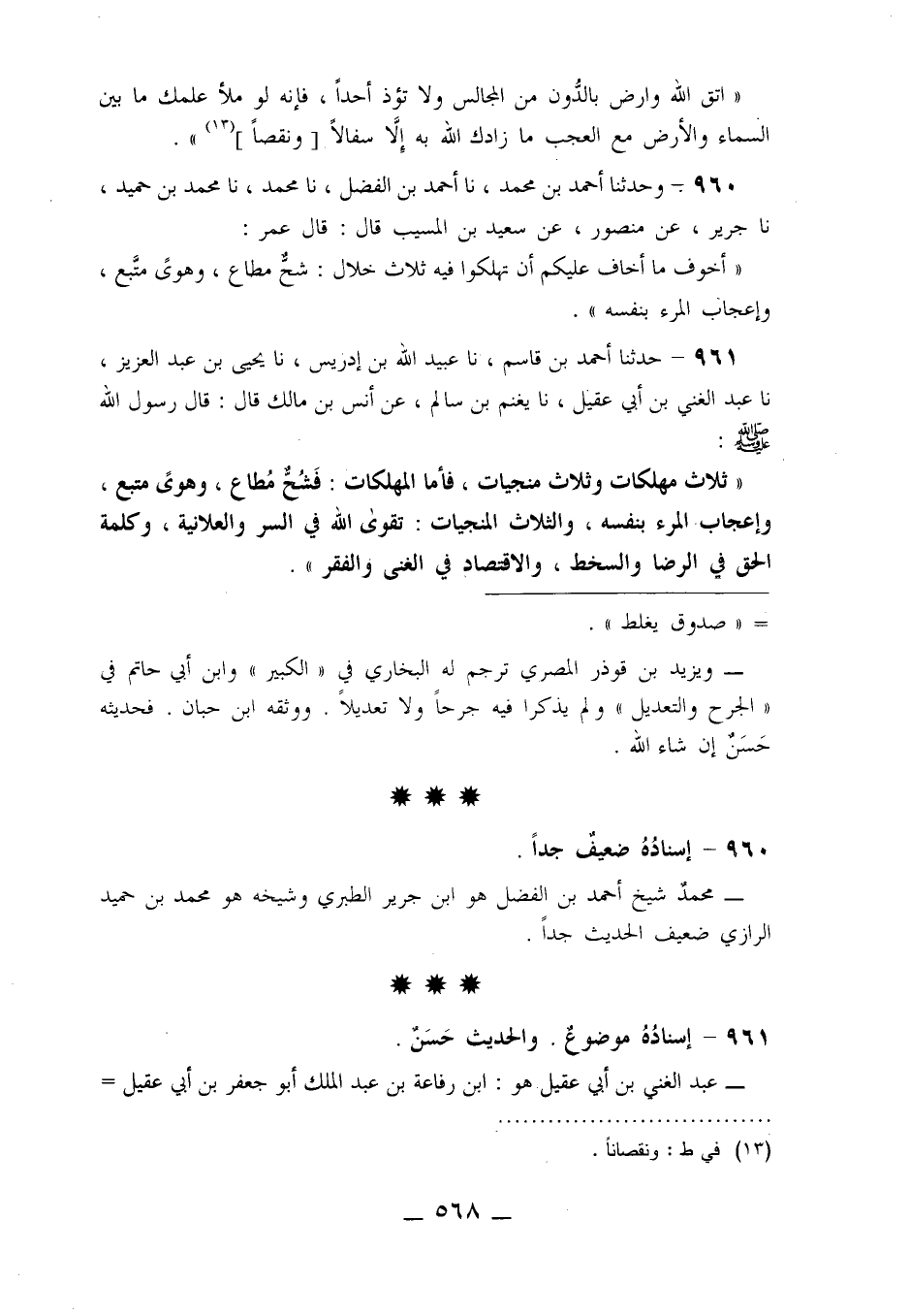 961 - حَدَّثَنَا أَحْمَدُ بْنُ قَاسِمٍ، نا عُبَيْدُ اللَّهِ بْنُ إِدْرِيسَ، نا يَحْيَى بْنُ عَبْدِ الْعَزِيزِ، نا عَبْدُ الْغَنِيِّ بْنُ أَبِي عَقِيلٍ، نا يَغْنُمُ بْنُ سَالِمٍ، عَنْ أَنَسِ بْنِ مَالِكٍ قَالَ: قَالَ رَسُولُ اللَّهِ صَلَّى اللَّهُ عَلَيْهِ وَسَلَّمَ: «§ثَلَاثٌ مُهْلِكَاتٌ وَثَلَاثٌ مُنْجِيَاتٌ، فَأَمَّا الْمُهْلِكَاتُ فَشُحٌّ مُطَاعٌ، وَهَوًى مُتَّبَعٌ، وَإِعْجَابُ الْمَرْءِ بِنَفْسِهِ، وَالثَّلَاثُ الْمُنْجِيَاتُ تَقْوَى اللَّهِ فِي السِّرِّ وَالْعَلَانِيَةِ، وَكَلِمَةُ الْحَقِّ فِي الرِّضَا وَالسَّخَطِ، وَالِاقْتِصَادُ فِي الْغِنَى وَالْفَقْرِ»