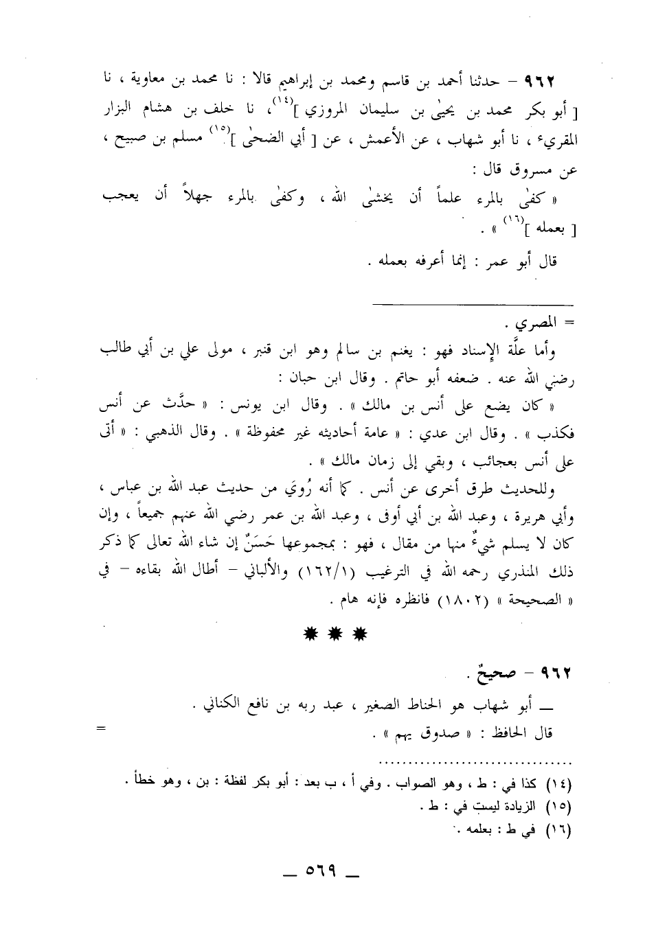 962 - حَدَّثَنَا أَحْمَدُ بْنُ قَاسِمٍ، وَمُحَمَّدُ بْنُ إِبْرَاهِيمَ قَالَا: نا مُحَمَّدُ بْنُ مُعَاوِيَةَ، نا أَبُو بَكْرٍ مُحَمَّدِ بْنِ يَحْيَى بْنِ سُلَيْمَانَ الْمَرْوَزِيُّ، نا خَلَفُ بْنُ هِشَامٍ الْبَزَّارُ الْمُقْرِئُ، نا أَبُو شِهَابٍ، عَنِ الْأَعْمَشِ، عَنْ أَبِي الضُّحَى مُسْلِمِ بْنِ صُبَيْحٍ، عَنْ مَسْرُوقٍ قَالَ: «§كَفَى بِالْمَرْءِ عِلْمًا أَنْ يَخْشَى اللَّهَ، وَكَفَى بِالْمَرْءِ جَهْلًا أَنْ يُعْجَبَ بِعَمَلِهِ» قَالَ أَبُو عُمَرَ: «إِنَّمَا أَعْرِفُهُ بِعَمَلِهِ» -[570]-