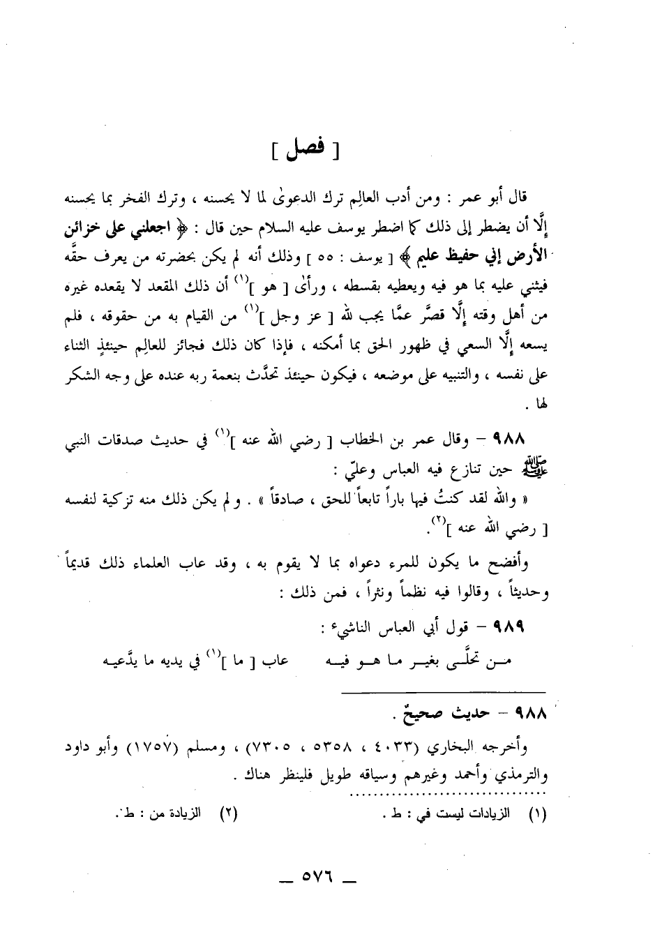 988 - وَقَالَ عُمَرُ بْنُ الْخَطَّابِ رَضِيَ اللَّهُ عَنْهُ فِي حَدِيثِ صَدَقَاتِ النَّبِيِّ صَلَّى اللَّهُ عَلَيْهِ وَسَلَّمَ حِينَ تَنَازَعَ فِيهَا الْعَبَّاسُ وَعَلِيٌّ: «وَاللَّهِ لَقَدْ كُنْتُ فِيهَا بَارًّا تَابِعًا لِلْحَقِّ صَادِقًا» , وَلَمْ يَكُنْ ذَلِكَ مِنْهُ تَزْكِيَةً لِنَفْسِهِ رَضِيَ اللَّهُ عَنْهُ، وَأَفْضَحُ مَا يَكُونُ لِلْمَرْءِ دَعْوَاهُ بِمَا لَا يَقُومُ بِهِ" وَقَدْ عَابَ الْعُلَمَاءُ ذَلِكَ قَدِيمًا وَحَدِيثًا، وَقَالُوا فِيهِ نَظْمًا وَنَثْرًا فَمِنْ ذَلِكَ