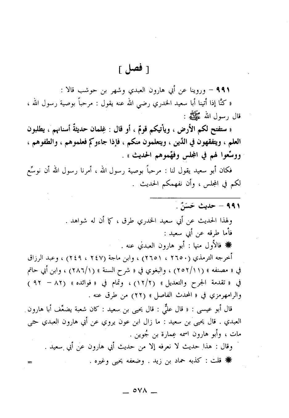 991 - وَرُوِّينَا عَنْ أَبِي هَارُونَ الْعَبْدِيِّ، وَشَهْرِ بْنِ حَوْشَبٍ قَالَا: كُنَّا إِذَا أَتَيْنَا أَبَا سَعِيدٍ الْخُدْرِيَّ رَضِيَ اللَّهُ عَنْهُ يَقُولُ: مَرْحَبًا بِوَصِيَّةِ رَسُولِ اللَّهِ , قَالَ رَسُولُ اللَّهِ صَلَّى اللَّهُ عَلَيْهِ وَسَلَّمَ: «§سَتُفْتَحُ لَكُمُ الْأَرْضُ وَيَأْتِيكُمْ قَوْمٌ» أَوْ قَالَ: «غِلْمَانٌ حَدِيثَةٌ أَسْنَانُهُمْ يَطْلُبُونَ الْعِلْمَ , وَيَتَفَقَّهُونَ فِي الدِّينِ وَيَتَعَلَّمُونَ مِنْكُمْ فَإِذَا جَاءُوكُمْ فَعَلِّمُوهُمْ وَأَلْطِفُوهُمْ وَوَسِّعُوا لَهُمْ فِي الْمَجْلِسِ وَفَهِّمُوهُمُ الْحَدِيثَ» فَكَانَ أَبُو سَعِيدٍ يَقُولُ لَنَا: مَرْحَبًا بِوَصِيَّةِ رَسُولِ اللَّهِ، «أَمَرَنَا رَسُولُ اللَّهِ أَنْ نُوَسِّعَ لَكُمْ فِي الْمَجْلِسِ وَأَنْ نُفَهِّمَكُمُ الْحَدِيثَ» -[580]-
