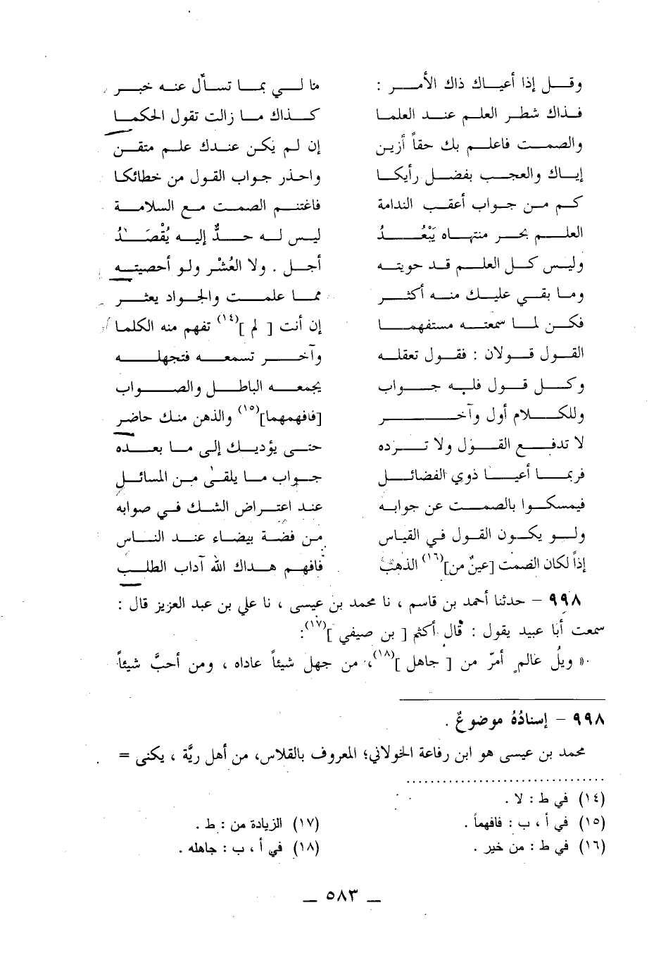 999 - وَقَالَ غَيْرُهُ: «عِلْمٌ لَا يَعْبُرُ مَعَكَ الْوَادِيَ لَا تُعَمِّرُ مَعَهُ النَّادِيَ، إِذَا ازْدَحَمَ الْجَوَّابُ خَفِيَ الصَّوَابُ، اللَّغَطُ يَكُونُ مَعَهُ الْغَلَطُ، لَوْ سَكَتَ مَنْ لَا يَعْلَمُ سَقَطَ الِاخْتِلَافُ»