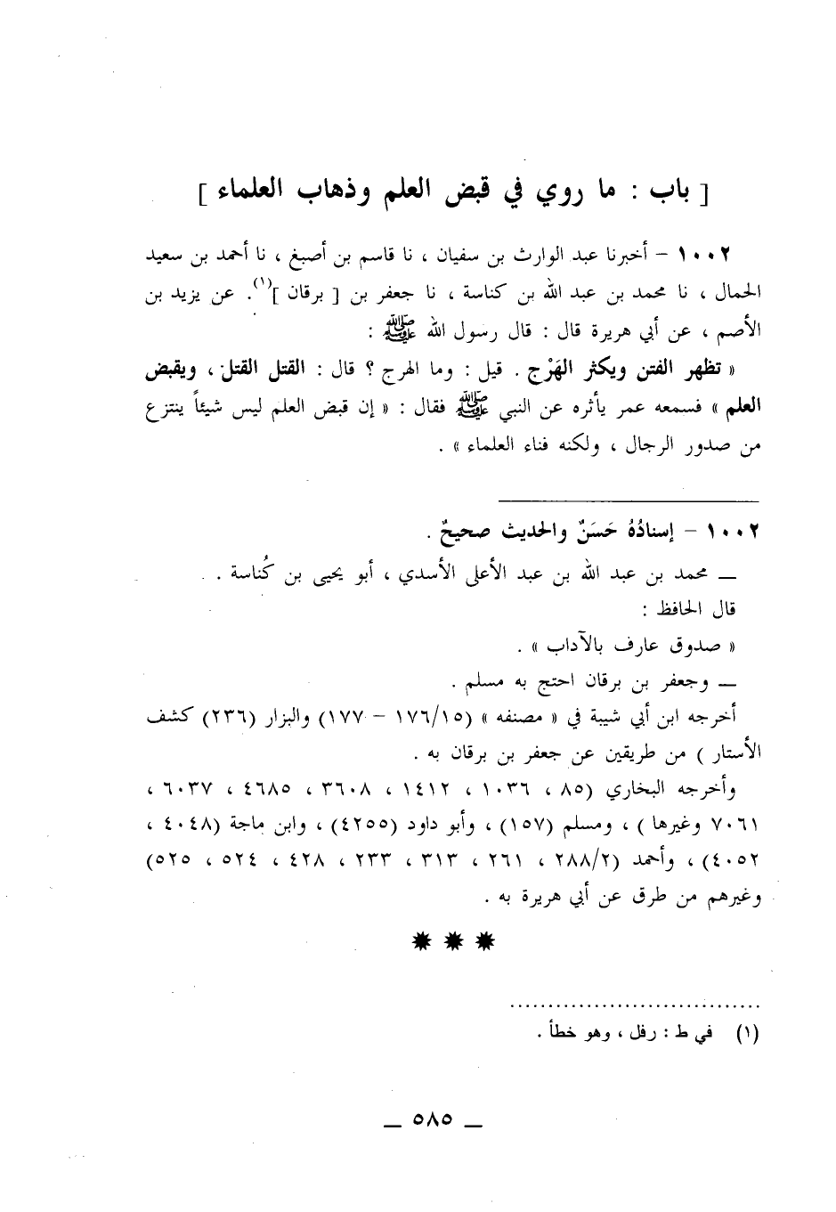 1002 - أَخْبَرَنَا عَبْدُ الْوَارِثِ بْنُ سُفْيَانَ، نا قَاسِمُ بْنُ أَصْبَغَ، نا أَحْمَدُ بْنُ سَعِيدٍ الْحَمَّالُ، نا مُحَمَّدُ بْنُ عَبْدِ اللَّهِ بْنِ كُنَاسَةَ، نا جَعْفَرُ بْنُ بُرْقَانَ، عَنْ يَزِيدَ بْنِ الْأَصَمِّ، عَنْ أَبِي هُرَيْرَةَ قَالَ: قَالَ رَسُولُ اللَّهِ صَلَّى اللَّهُ عَلَيْهِ وَسَلَّمَ: «§تَظْهَرُ الْفِتَنُ وَيَكْثُرُ الْهَرْجُ» قِيلَ: وَمَا الْهَرْجُ؟ قَالَ: «الْقَتْلُ الْقَتْلُ وَيُقْبَضُ الْعِلْمُ» فَسَمِعَهُ عُمَرُ يَأْثُرُهُ عَنِ النَّبِيِّ صَلَّى اللَّهُ عَلَيْهِ وَسَلَّمَ فَقَالَ: «إِنَّ قَبْضَ الْعِلْمِ لَيْسَ شَيْئًا يُنْتَزَعُ مِنْ صُدُورِ الرِّجَالِ وَلَكِنَّهُ فَنَاءُ الْعُلَمَاءِ»