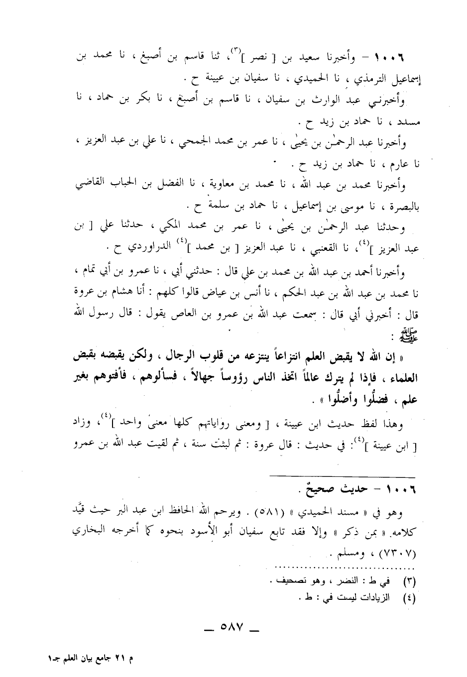 1006 - وَأَخْبَرَنَا سَعِيدُ بْنُ نَصْرٍ، ثنا قَاسِمُ بْنُ أَصْبَغَ، نا مُحَمَّدُ بْنُ إِسْمَاعِيلَ التِّرْمِذِيُّ، نا الْحُمَيْدِيُّ، نا سُفْيَانُ بْنُ عُيَيْنَةَ، ح وَأَخْبَرَنِي عَبْدُ الْوَارِثِ بْنُ سُفْيَانَ، نا قَاسِمُ بْنُ أَصْبَغَ، نا بَكْرُ بْنُ حَمَّادٍ، نا مُسَدَّدٌ، نا حَمَّادُ بْنُ زَيْدٍ، ح وَأَخْبَرَنَا عَبْدُ الرَّحْمَنِ بْنُ يَحْيَى، نا عُمَرُ بْنُ مُحَمَّدٍ الْجُمَحِيُّ، نا عَلِيُّ بْنُ عَبْدِ الْعَزِيزِ، نا عَارِمٌ، نا حَمَّادُ بْنُ زَيْدٍ، ح وَأَخْبَرَنَا مُحَمَّدُ بْنُ عَبْدِ اللَّهِ، نا مُحَمَّدُ بْنُ مُعَاوِيَةَ، نا الْفَضْلُ بْنُ الْحُبَابِ الْقَاضِي بِالْبَصْرَةِ نا مُوسَى بْنُ إِسْمَاعِيلَ، نا حَمَّادُ بْنُ سَلَمَةَ، ح وَحَدَّثَنَا عَبْدُ الرَّحْمَنِ بْنُ يَحْيَى، نا عُمَرُ بْنُ مُحَمَّدٍ الْمَكِّيُّ، حَدَّثَنَا عَلِيُّ بْنُ عَبْدِ الْعَزِيزِ، نا الْقَعْنَبِيُّ، نا عَبْدُ الْعَزِيزِ بْنُ مُحَمَّدِ الدَّرَاوَرْدِيُّ، ح وَأَخْبَرَنَا أَحْمَدُ بْنُ عَبْدِ اللَّهِ بْنِ مُحَمَّدِ بْنِ عَلِيٍّ قَالَ: حَدَّثَنِي أَبِي، نا عَمْرُو بْنُ أَبِي تَمَّامٍ، نا مُحَمَّدُ بْنُ عَبْدِ اللَّهِ بْنِ عَبْدِ الْحَكَمِ، نا أَنَسُ بْنُ عِيَاضٍ، قَالُوا كُلُّهُمْ: أنا هِشَامُ بْنُ عُرْوَةَ قَالَ: أَخْبَرَنِي أَبِي قَالَ: سَمِعْتُ عَبْدَ اللَّهِ بْنَ عَمْرِو بْنِ الْعَاصِ يَقُولُ: قَالَ رَسُولُ اللَّهِ صَلَّى اللَّهُ عَلَيْهِ وَسَلَّمَ: «إِنَّ §اللَّهَ لَا يَقْبِضُ الْعِلْمَ انْتِزَاعًا يَنْتَزِعُهُ مِنْ قُلُوبِ الرِّجَالِ، وَلَكِنْ يَقْبِضُهُ بِقَبْضِ الْعُلَمَاءِ، فَإِذَا لَمْ يَتْرُكْ عَالِمًا اتَّخَذَ النَّاسُ رُءُوسًا جُهَّالًا فَسَأَلُوهُمْ فَأَفْتَوْهُمْ بِغَيْرِ عِلْمٍ فَضَلُّوا وَأَضَلُّوا» ، وَهَذَا لَفْظُ حَدِيثِ ابْنِ عُيَيْنَةَ، وَمَعْنَى رِوَايَاتِهِمْ كُلِّهَا مَعْنًى وَاحِدٌ , وَزَادَ ابْنُ عُيَيْنَةَ فِي حَدِيثٍ، قَالَ عُرْوَةُ: «ثُمَّ لَبِثْتُ سَنَةً ثُمَّ لَقِيتُ عَبْدَ اللَّهِ بْنَ عَمْرٍو -[588]- بِالطَّوَافِ فَسَأَلْتُهُ عَنْهُ فَأَخْبَرَنِي بِهِ، وَلَيْسَتْ هَذِهِ الزِّيَادَةُ الَّتِي فِي حَدِيثِ ابْنِ عُيَيْنَةَ فِي حَدِيثِ غَيْرِهِ مِمَّنْ ذَكَرْنَا مَعَهُ» وَرَوَى هَذَا الْحَدِيثَ أَيْضًا عَنْ هِشَامِ بْنِ عُرْوَةَ جَمَاعَةٌ مِنْهُمُ الْأَوْزَاعِيُّ، وَمِسْعَرٌ، وَشُعْبَةُ، وَابْنُ عَجْلَانَ، وَمَعْمَرٌ، وَإِبْرَاهِيمُ بْنُ إِسْمَاعِيلَ بْنِ مُجَمِّعٍ، وَحَسَّانُ بْنُ إِبْرَاهِيمَ الْكَرْمَانِيُّ، وَيَحْيَى الْقَطَّانُ كُلُّهُمْ عَنْ هِشَامِ بْنِ عُرْوَةَ بِمَعْنًى وَاحِدٍ. وَرَوَاهُ الزُّهْرِيُّ، وَيَحْيَى بْنُ أَبِي كَثِيرٍ، وَأَبُو الْأَسْوَدِ مُحَمَّدُ بْنُ عَبْدِ الرَّحْمَنِ يَتِيمُ عُرْوَةَ، كُلُّهُمْ عَنْ عُرْوَةَ بْنِ الزُّبَيْرِ، عَنْ عَبْدِ اللَّهِ بْنِ عَمْرٍو عَنِ النَّبِيِّ صَلَّى اللَّهُ عَلَيْهِ وَسَلَّمَ بِنَحْوِ رِوَايَةِ هِشَامِ بْنِ عُرْوَةَ وَمَعْنَاهَا "
