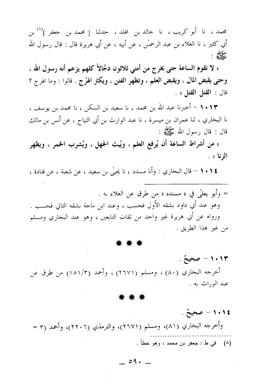1013 - أَخْبَرَنَا عَبْدُ اللَّهِ بْنُ مُحَمَّدٍ، نا سَعِيدُ بْنُ السَّكَنِ، نا مُحَمَّدُ بْنُ يُوسُفَ، نا الْبُخَارِيُّ، ثنا عِمْرَانُ بْنُ مَيْسَرَةَ، نا عَبْدُ الْوَارِثِ، عَنْ أَبِي التَّيَّاحِ، عَنْ أَنَسِ بْنِ مَالِكٍ قَالَ: قَالَ رَسُولُ اللَّهِ صَلَّى اللَّهُ عَلَيْهِ وَسَلَّمَ §«مِنْ أَشْرَاطِ السَّاعَةِ أَنْ يُرْفَعَ الْعِلْمُ وَيُبَثَّ الْجَهْلُ وَيُشْرَبَ الْخَمْرُ وَيَظْهَرَ الزِّنَا»
