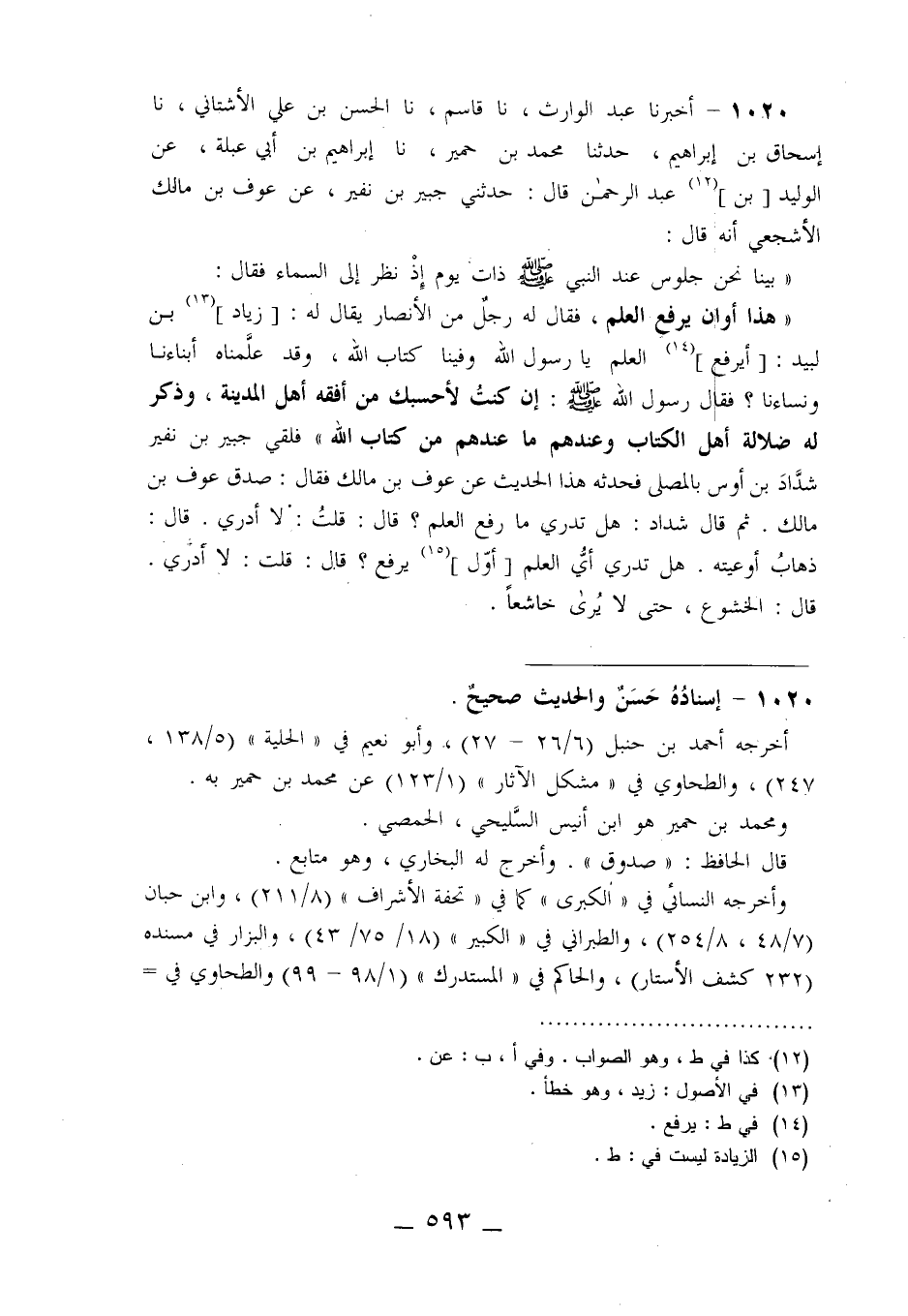 1020 - أَخْبَرَنَا عَبْدُ الْوَارِثِ، نا قَاسِمٌ، نا الْحَسَنُ بْنُ عَلِيٍّ الْأُشْنَانِيُّ، نا إِسْحَاقُ بْنُ إِبْرَاهِيمَ، حَدَّثَنَا مُحَمَّدُ بْنُ حُمَيْرٍ، نا إِبْرَاهِيمُ بْنُ أَبِي عَبْلَةَ، عَنِ الْوَلِيدِ بْنِ عَبْدِ الرَّحْمَنِ قَالَ: حَدَّثَنِي جُبَيْرُ بْنُ نُفَيْرٍ، عَنْ عَوْفِ بْنِ مَالِكٍ الْأَشْجَعِيِّ، أَنَّهُ قَالَ: بَيْنَا نَحْنُ جُلُوسٌ عِنْدَ النَّبِيِّ صَلَّى اللَّهُ عَلَيْهِ وَسَلَّمَ ذَاتَ يَوْمٍ إِذْ نَظَرَ إِلَى السَّمَاءِ فَقَالَ: §«هَذَا أَوَانُ يُرْفَعُ الْعِلْمُ» فَقَالَ لَهُ رَجُلٌ مِنَ الْأَنْصَارِ يُقَالُ لَهُ زِيَادُ بْنُ لَبِيدٍ: أَيُرْفَعُ الْعِلْمُ يَا رَسُولَ اللَّهِ وَفِينَا كِتَابُ اللَّهِ وَقَدْ عَلَّمْنَاهُ أَبْنَاءَنَا وَنِسَاءَنَا؟ فَقَالَ رَسُولُ اللَّهِ صَلَّى اللَّهُ عَلَيْهِ وَسَلَّمَ: «إِنْ كُنْتُ لَأَحْسَبُكَ مِنْ أَفْقَهِ أَهْلِ الْمَدِينَةِ» وَذَكَرَ لَهُ ضَلَالَةَ أَهْلِ الْكِتَابِ وَعِنْدَهُمْ مَا عِنْدَهُمْ مِنْ كِتَابِ اللَّهِ فَلَقِيَ جُبَيْرُ بْنُ نُفَيْرٍ شَدَّادَ بْنَ أَوْسٍ بِالْمُصَلَّى فَحَدَّثَهُ هَذَا الْحَدِيثَ عَنْ عَوْفِ بْنِ مَالِكٍ، فَقَالَ: صَدَقَ عَوْفُ بْنُ مَالِكٍ ثُمَّ قَالَ شَدَّادٌ: هَلْ تَدْرِي مَا رَفْعُ الْعِلْمِ؟ قَالَ: قُلْتُ: لَا أَدْرِي قَالَ: ذَهَابُ أَوْعِيَتِهِ، هَلْ تَدْرِي أَيُّ الْعِلْمِ أَوَّلُ يُرْفَعُ؟ قَالَ: قُلْتُ: لَا أَدْرِي قَالَ: «الْخُشُوعُ حَتَّى لَا يُرَى خَاشِعٌ»