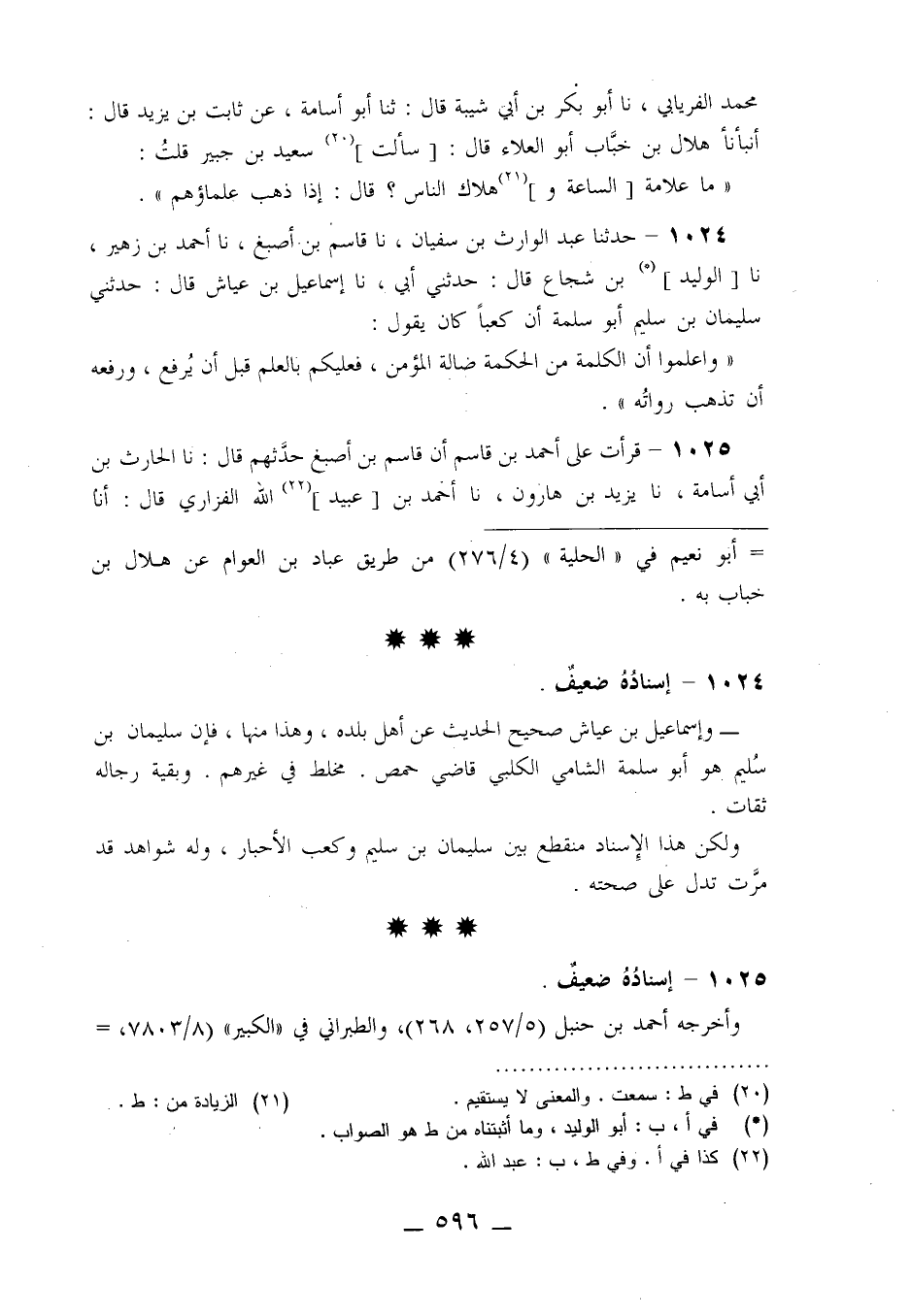 1024 - حَدَّثَنَا عَبْدُ الْوَارِثِ بْنُ سُفْيَانَ، نا قَاسِمُ بْنُ أَصْبَغَ، نا أَحْمَدُ بْنُ زُهَيْرٍ، نا الْوَلِيدُ بْنُ شُجَاعٍ قَالَ: حَدَّثَنِي أَبِي، نا إِسْمَاعِيلُ بْنُ عَيَّاشٍ قَالَ: حَدَّثَنِي سُلَيْمَانُ بْنُ سُلَيْمٍ أَبُو سَلَمَةَ، أَنَّ كَعْبًا، كَانَ يَقُولُ: «وَاعْلَمُوا أَنَّ §الْكَلِمَةَ مِنَ الْحِكْمَةِ ضَالَّةُ الْمُؤْمِنِ فَعَلَيْكُمْ بِالْعِلْمِ قَبْلَ أَنْ يُرْفَعَ , وَرَفْعُهُ أَنْ تَذْهَبَ رُوَاتُهُ»
