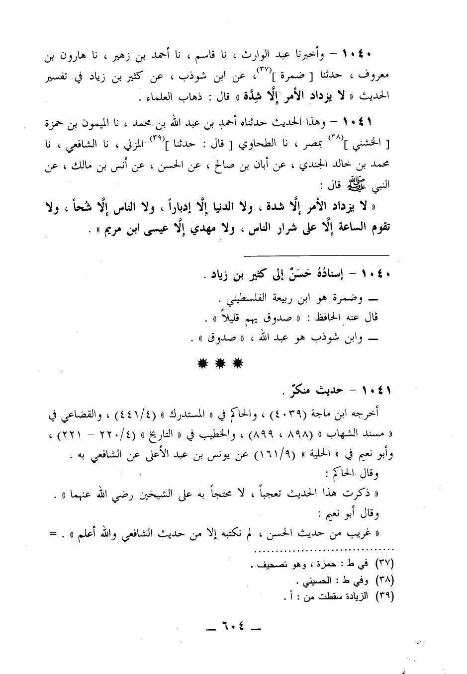 1040 - وَأَخْبَرَنَا عَبْدُ الْوَارِثِ، نا قَاسِمُ، نا أَحْمَدُ بْنُ زُهَيْرٍ، نا هَارُونُ بْنُ مَعْرُوفٍ، حَدَّثَنَا ضَمْرَةُ، عَنِ ابْنِ شَوْذَبٍ، عَنْ كَثِيرِ بْنِ زِيَادٍ فِي تَفْسِيرِ الْحَدِيثِ: §لَا يَزْدَادُ الْأَمْرُ إِلَّا شِدَّةً قَالَ: «ذَهَابُ الْعُلَمَاءِ»